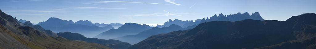 Oben angekommen, haben wir einen herrlichen Ausblick auf die Südtiroler Dolomiten mit Plattkofel, Langkofel, Sella mit Piz Boe, Heiligkreuzkofel, Marmolata und die Pale di San Martino etc.