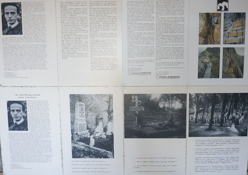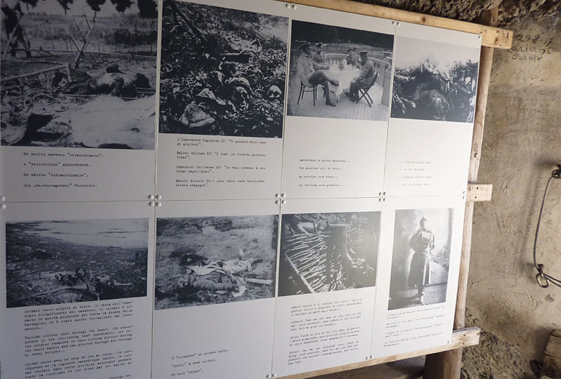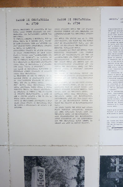 Das Kriegsmuseum, etwas unter dem Gipfel der Cima Costabella, erweist sich als ein über eine steile Holztreppe erreichbares MG Nest der Alpini, in dem Fotos von kriegsgezeichneten Soldaten hängen und Sprüche die Erlebnisse der einfachen Soldaten und das Leben der führenden Militärs in starkem Kontrast zeichnen. Wir sind allesamt tief beeindruckt.