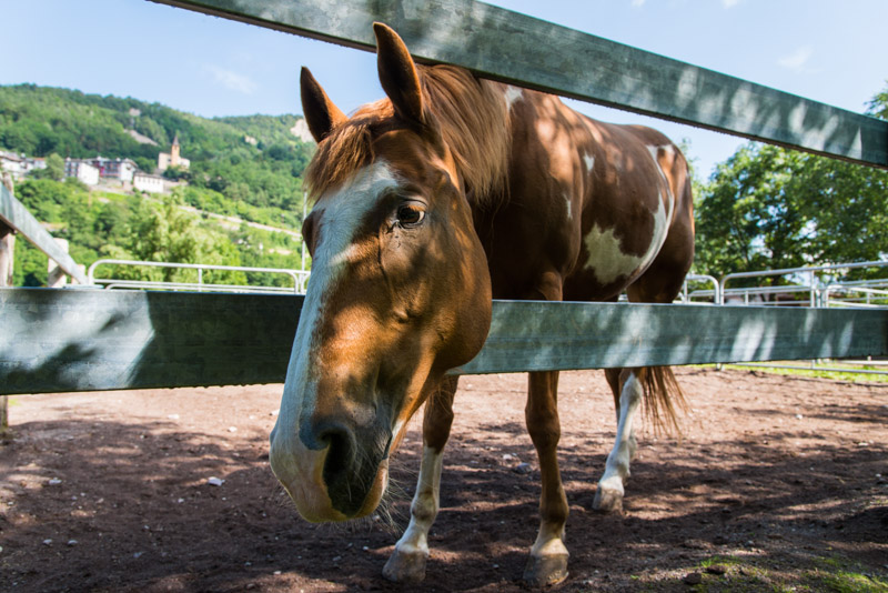 Der Wanderweg führt an einem Reitstall vorbei. Die Pferde sind total zutraulich, erwarten sich wahrscheinlich von den Vorbeispaziereden ein Leckerli. Wir verzichten darauf, denn ich kann mir denken, dass das Verabreichen von Süßigkeiten von den Pferdebesitzern nicht gerne gesehen wird.