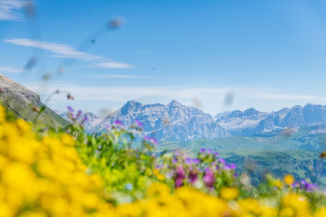 Hinter uns das mächtige Dolomitenmassiv Sella mit dem Piz Boè als höchste Erhebung. In der Ferne hinter Arabba die Fanesgruppe und rechts daneben die Tofane. Ein Panoramasicht auf Dolomitengranden wie sie im Buche steht.