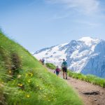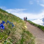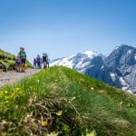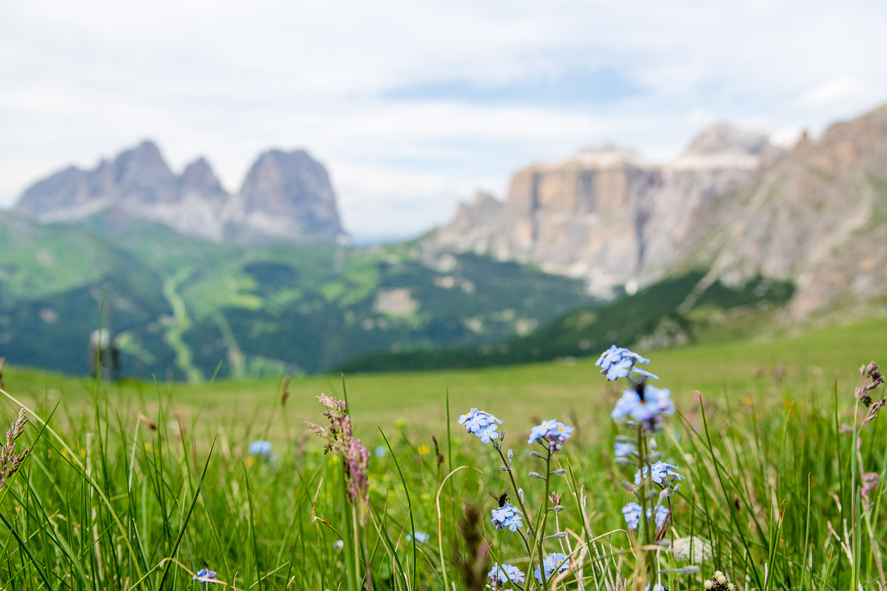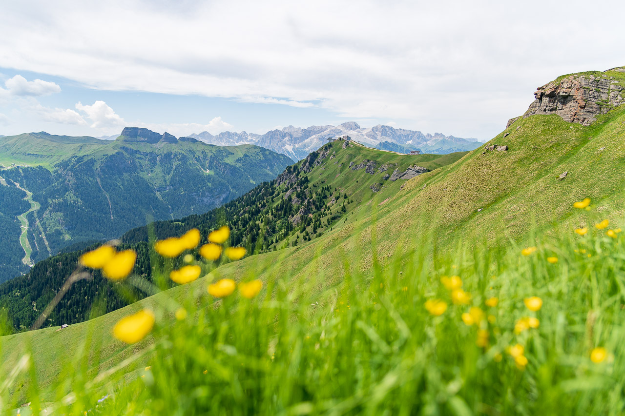 Hinter uns die Rosengartengruppe mit dem Kesselkogel, rechts die Dreitausenderin Marmolada mit Gran Vernel (3.210 m), Punta Penia (3.343 m) und Punta Rocca (3.309 m) und dem Gletscherfeld, wir auf einem flachen alpinen Wanderweg, der durch grüne saftige Alpenwiesen führt. Gelber Hahnenfuß, teilweise sogar Dotterblumen und viele verblühte Alpen-Kuhschellen säumen die Wiesen um den Bindelweg-Steig.