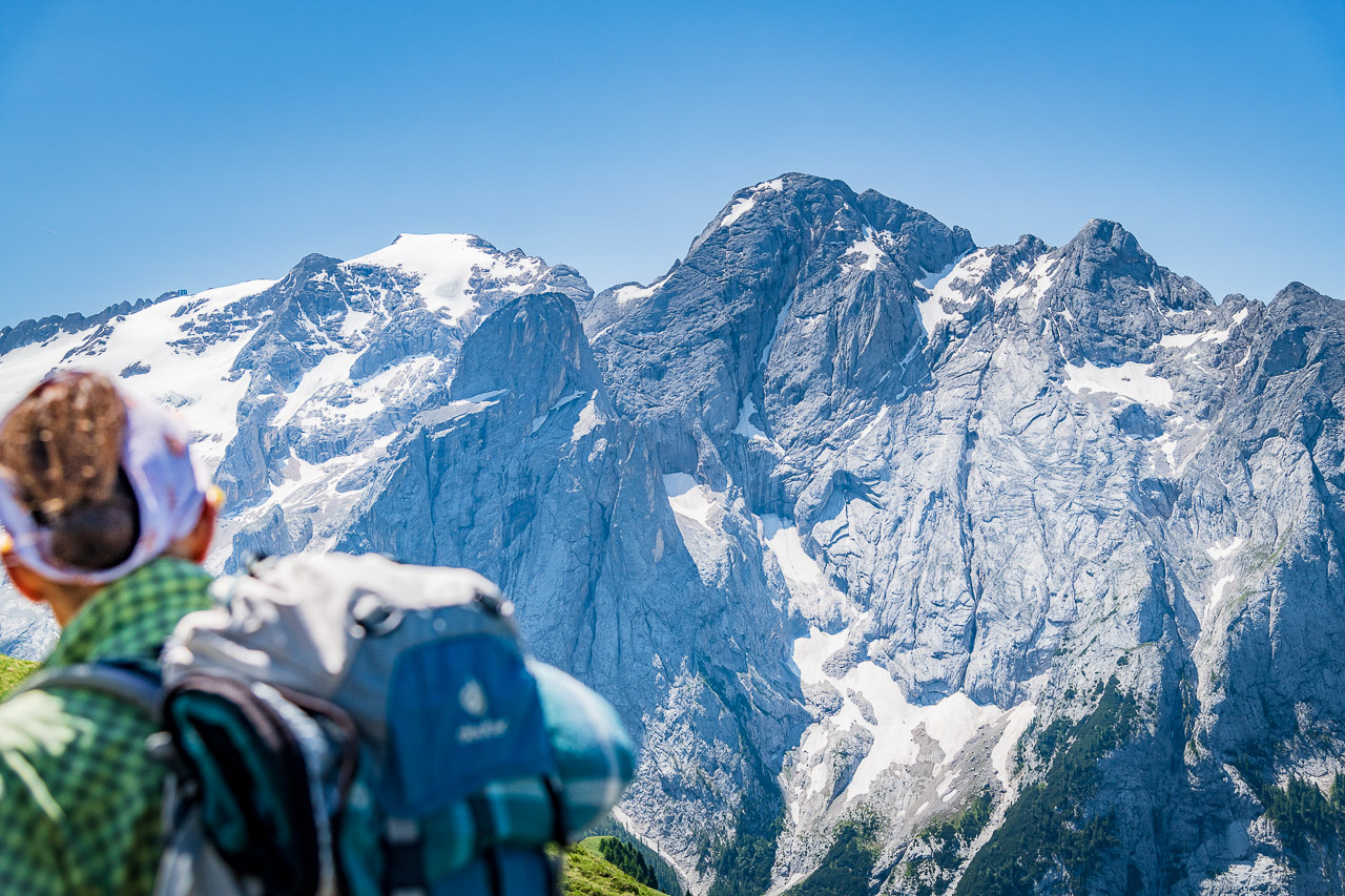 Wow! Die Königin in all ihrer grau-weißen Pracht! Greifbar nahe und doch für uns Anti-Kletterer und Steigeisen-Verweigerer unerreichbar. Die Dolomitenkönigin Marmolata (Italienisch Marmolada) zeigt sich von ihrer Schattenseite, sprich Nordseite, und ist dabei so wunderschön.