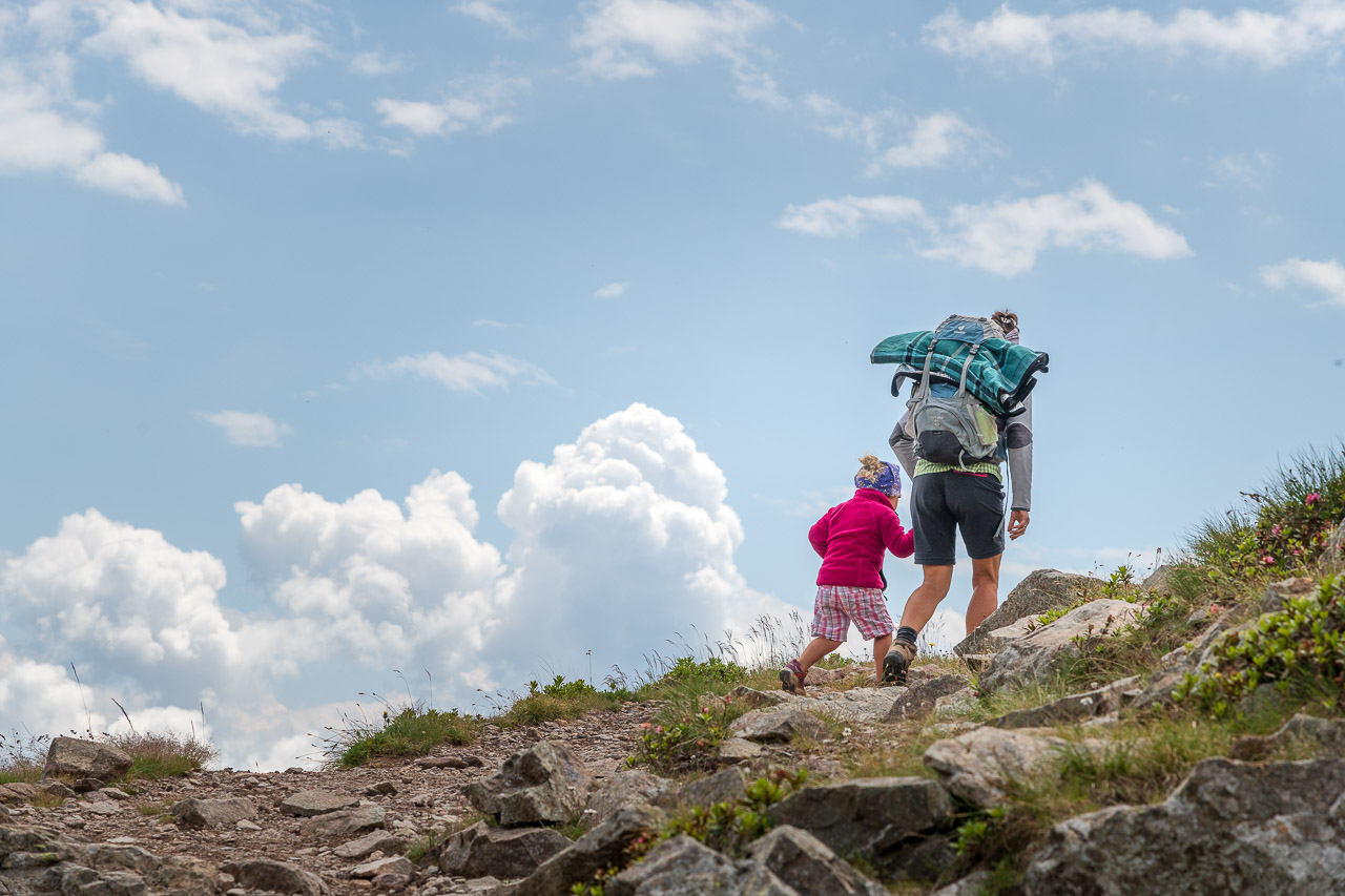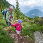 Ein zwei Erinnerungsfotos sind geschossen, nun wandern wir über den leichteren Steig Nr. 10 hinunter Richtung Laugen Alm. Der Abstieg erweist sich trotz des weniger steilen Wanderpfades als beschwerlicher als gedacht – zumindest für uns Erwachsene. Anna und Hannes würden um diese Uhrzeit nun ihr Mittagsschläfchen halten, was sich aber heute nicht ausgeht. Sie bestrafen uns damit, dass sie sich an unseren Händen ab und zu einfach hängen lassen. Außer der besten Mami von allen, einer 20 km pro Tag Frau, sind wir andere inzwischen völlig untrainiert. Ein an der Hand baumelndes Kind strapaziert den Arm und auch die Fuß- Bremsmuskulatur enorm. Nach unzähligen Ermahnungen und nach einem Sturz von Uwe und Hannes (glimpflich abgegangen und in Lachen geendet) sind die zwei Kleinen dann trotzdem bereit etwas ordentlicher zu gehen.