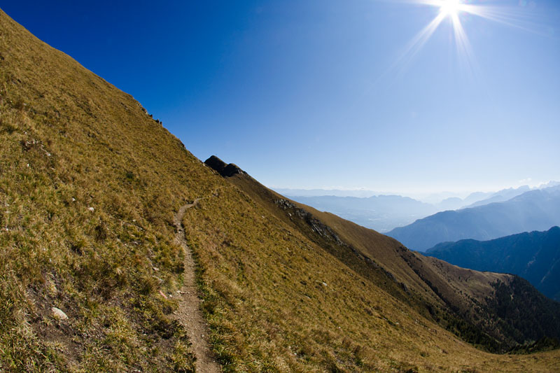 Wenige Höhenmeter später stehen wir und noch ein weiterer Wanderer ziemlich unschlüssig vor einer Abzweigung. Der markierte Weg verläuft nach links aber wir müssten laut Wanderkarte theoretisch dem grasigen Grat folgend in östlicher Richtung zur Alm Malga Stablei runter gehen. Der Steig ist aber sogar mit dem Fernglas des unschlüssigen Wanderers nicht auszumachen und kann fast nur erahnt werden. Da ich das Gelände als nicht besonders gefährlich einstufe, beschließen wir, es zu wagen und dem Grat zu folgen.