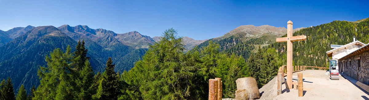 Wir sind nicht allein. Eine italienische Familie ist nicht so sehr mit der herrlichen Aussicht auf das Nonstal, die Brentagruppe, die Ortlergruppe, die Berge südlich des Ultentales, den Hochwart und die Laugenspitze und in der Ferne die Dolomiten beschäftigt, sondern mehr mit sich selbst, wobei ein Familienmitglied wie ein Wasserfall lautstark, fast schon unfein plaudert.