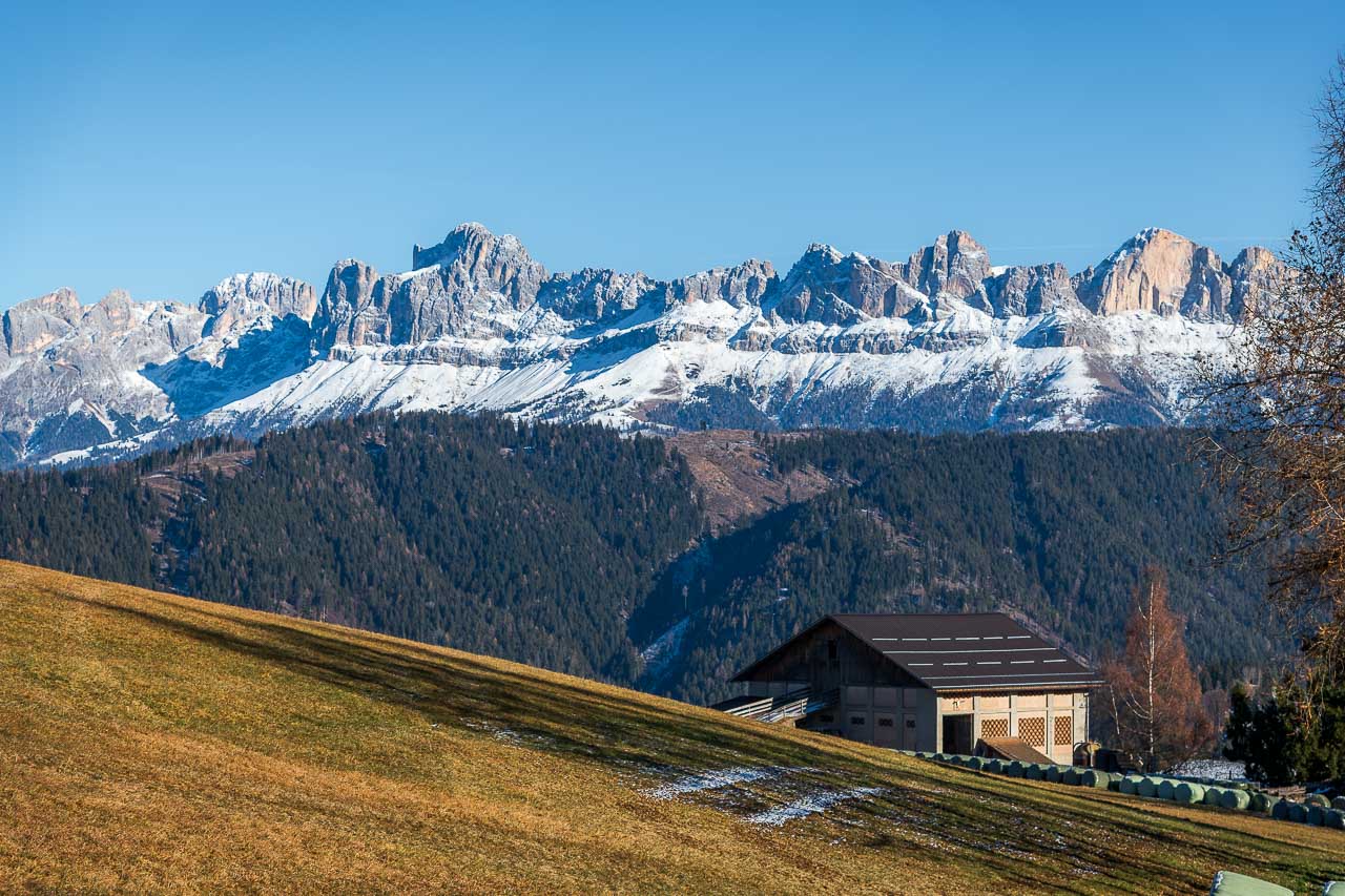 Nun folgen wir der Beschilderung Richtung St. Helena, wandern bis zur Landesstraße 72, begleiten sie ein paar Meter und biegen dann links in den schönen Panoramaweg ein. Er führt uns um den St.-Helena-Hügel herum, vorbei an einzelnen Hofstellen. Der Panoramaweg verdient seinen Namen zurecht: Die Spitzen der Rosengartengruppeund des Latemarsbegeistern. Heute sind sie – im Unterschied zu vor 5 Monaten – weiß. Ein traumhafter Dolomitenblick, der seinesgleichen sucht.