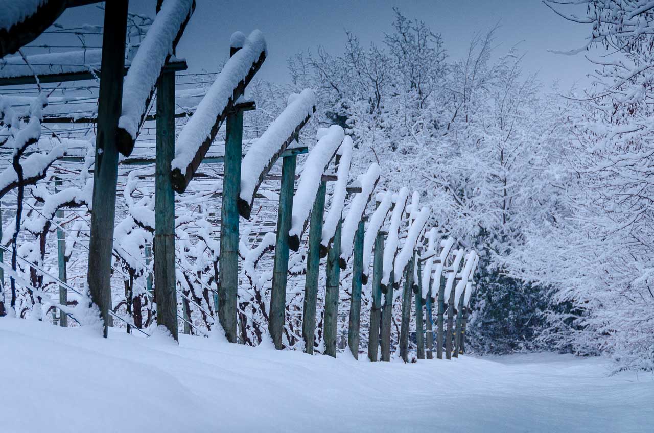 Klein Venedig in Kaltern am See, genauso schaut das hier aus. Da wandert doch tatsächlich ein Bach lautstark quer durch Weinberge, schlüpft unter die Drahtrahmen der Spalier hindurch, spaziert entlang der Pergeln, biegt dann links in eine asphaltierte Straße ein, folgt ruhig und schön brav der Straße, bricht nicht aus, obwohl das Gelände rechts und links teilweise ein wenig tiefer liegt. Das Ziel ist klar, der Kalterer See! Leider haben wir keine Gondel (siehe Gondel am Kalterer See) dabei, sonst könnten wir bis zu unserem Startpunkt des heutigen Spazierganges zurück schiffen oder gondeln.