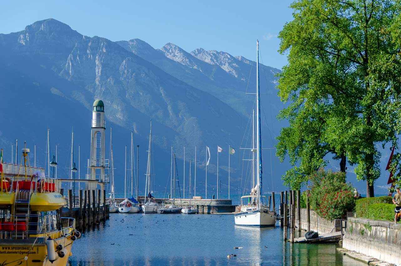Die Segelyacht „Siora“ ankert im Canale della Rocca zwischen der Wasserburg Rocca di Riva und dem Yachthafen von Riva del Garda