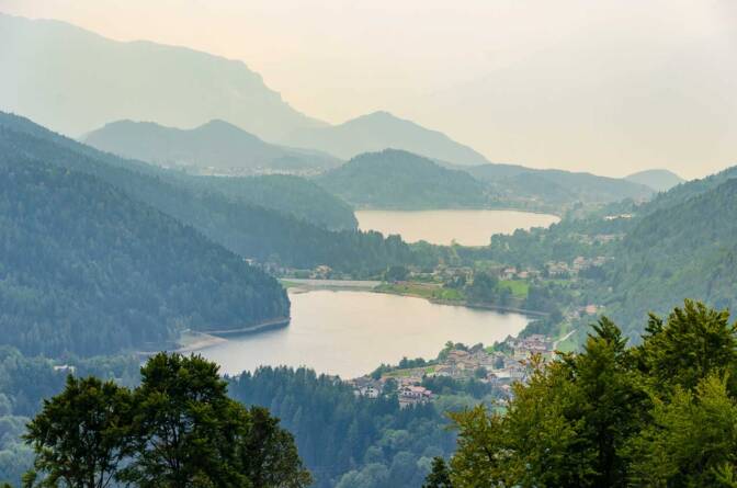 Das Beste an dem Gasthaus aber ist der Ausblick! Ohne es so richtig zu merken, sind wir nämlich vom Cembratal herüber ins Val di Pinè, ein wunderschönes Hochplateau, das auch Altopiano di Pinè genannt wird, mit seinen zwei von grünen Hügeln umringten Seen, Lago delle Piazze und Lago di Serraia, gekommen.