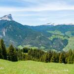 Der Rundumblick ist nur mit Superlativen zu beschreiben: phänomenal, atemberaubend, einfach wunderschön. Außer Peitlerkofel, Geisler, Puez, Sassongher, Marmolada und Heiligkreuzkofelgruppe sehen wir von hier auch noch die Berggipfel des Naturparks Sennes und weiter nördlich bis hinüber zu den Zillertaler und Ötztaler Alpen. Unten im Tal liegt St. Vigil am Enneberg mit dem Skiberg Kronplatz dahinter.