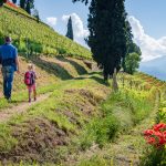 Entlang des Höllentalbaches und des Traminer Geoweges wandern wir jetzt zu viert hinunter zum Hotel Winzerhof, treffen dort Irene, Lisa und Hannes und spazieren dann gemeinsam den Themenweg Naturerlebnisweg Tramin entlang bis zu den Weinbergen des Weinguts Hofstätter. Hier biegen wir links ab und wandern zum Kolbenhof hinauf.