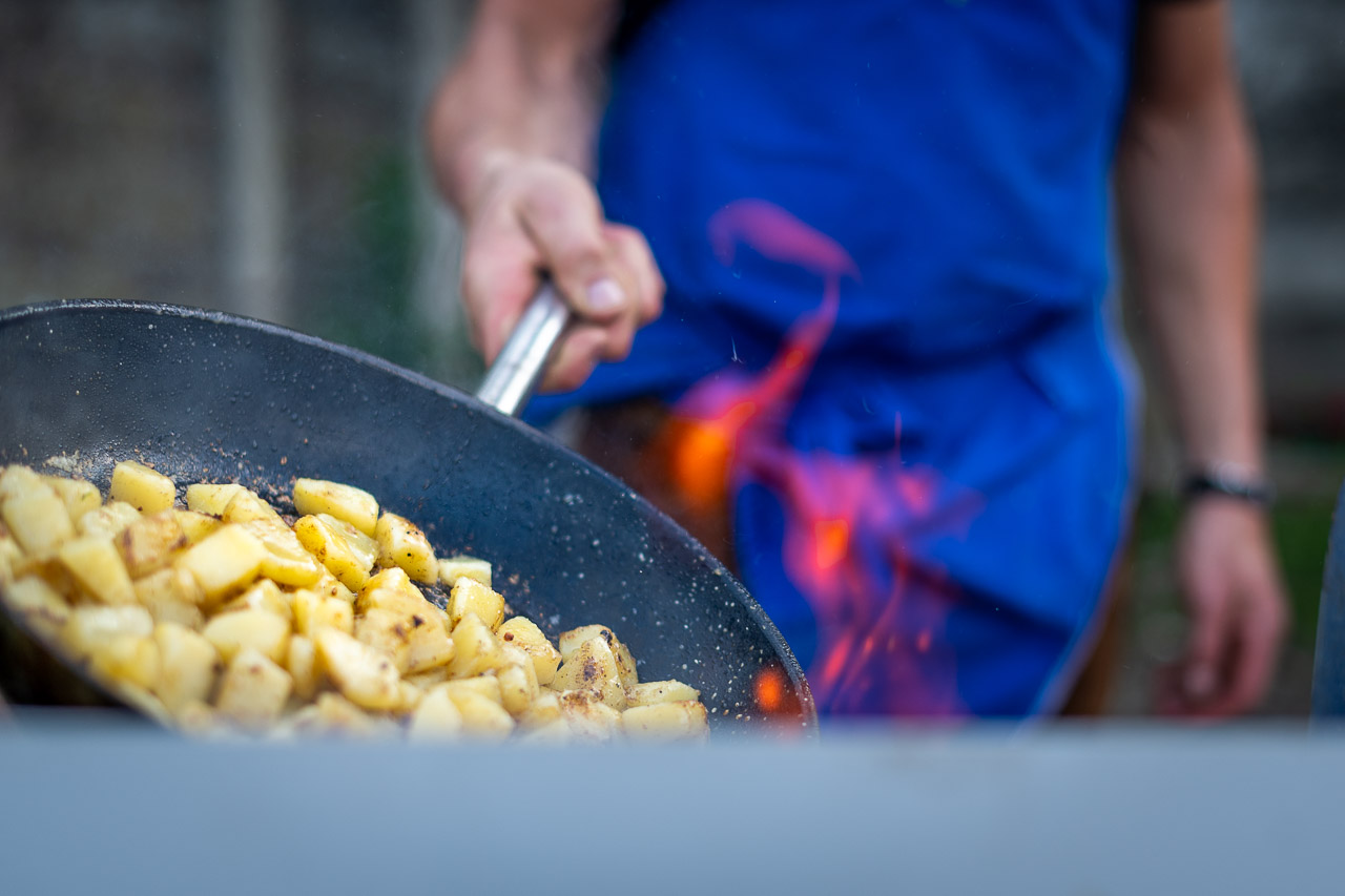 Zu den Knödeln gibt einen Diolinoir, einen kräftigen Rotwein, der nach Beeren und Waldfrüchte schmeckt. Zu Spargel hätte so mancher Weinexperte zu Weißwein geraten, ich mag untypische Kombinationen. Der Diolinoir ist kein DOC Wein, aber das sagt ja nichts darüber aus wie gut er schmeckt. Derweil packt der Kofler Bua seine Ziehharmonika aus und so schließt sich der Kreis der drei Sinne: schauen, schmecken, hören.