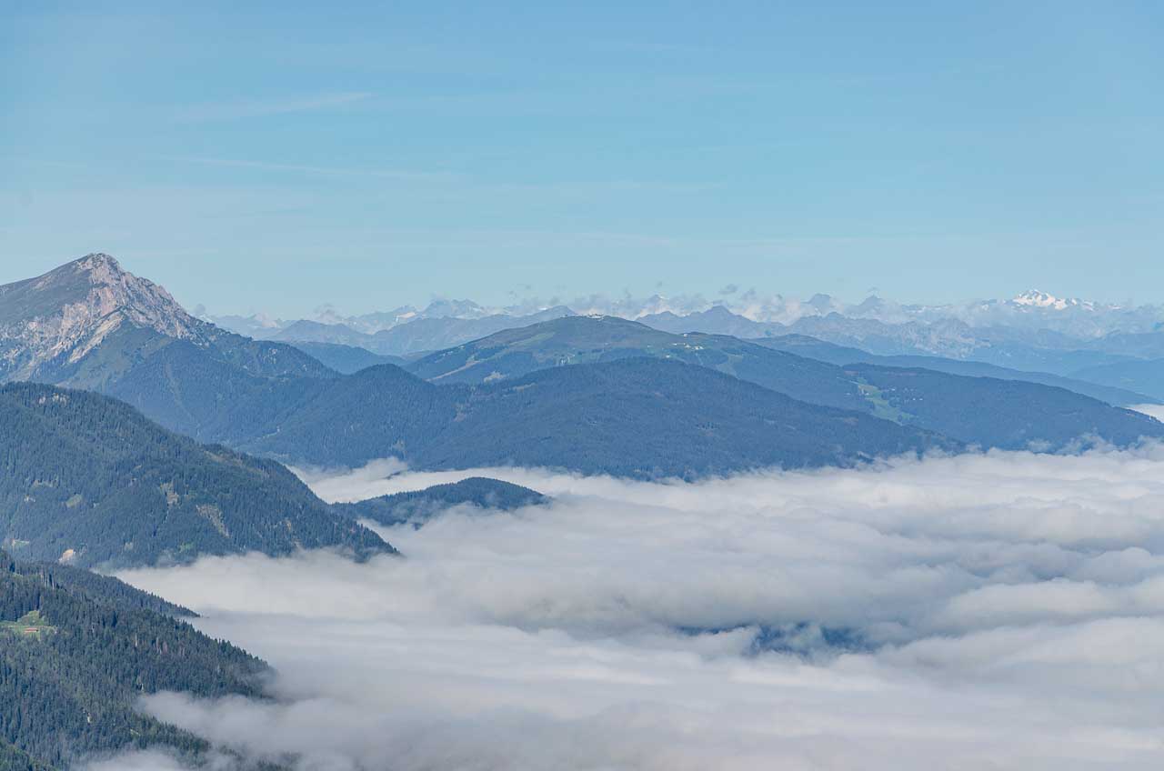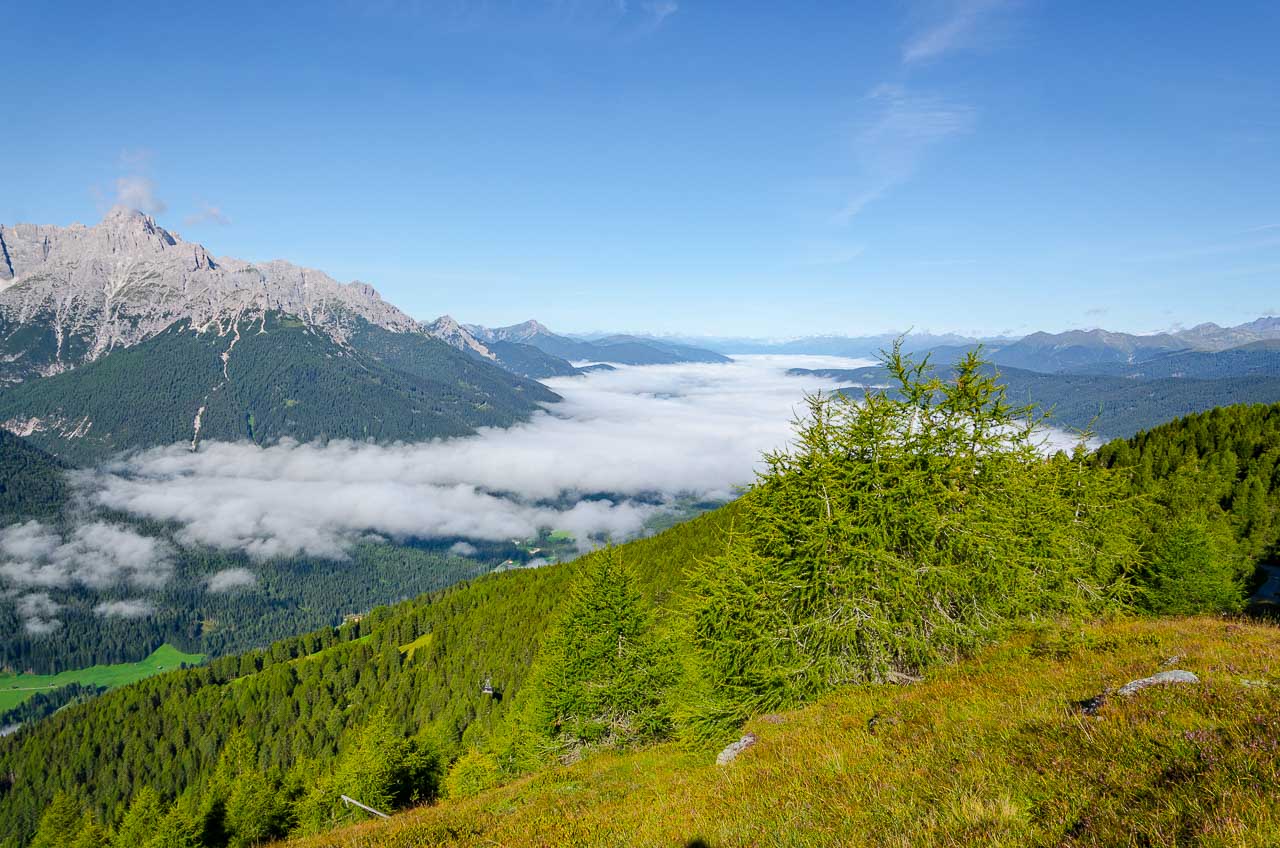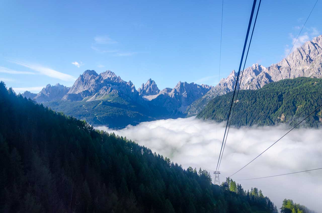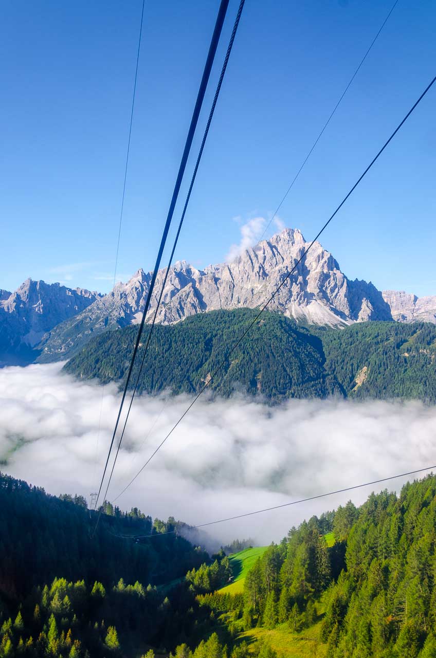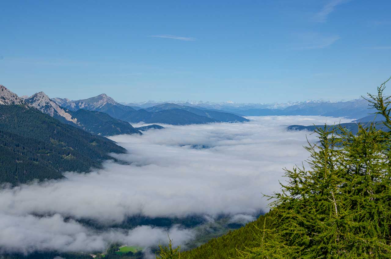 Meter um Meter geht es höher hinaus und Meter um Meter wird der Nebel dichter. Plötzlich, herrlicher Sonnenschein. Ich hatte Recht! Bloß ein Nebelfeld, welches sich über das Sextner Tal gelegt hat. Gewaltig schön der Anblick der Sextner Dolomiten, die aus dem Nebelfeld herausstechen. Interessant der Anblick des Pustertals mit dem weißen Schleier darauf. Wir sind geradezu froh, dass es gestern geregnet hat, sonst könnten wir diesen wunderbaren Anblick heute nicht erleben.