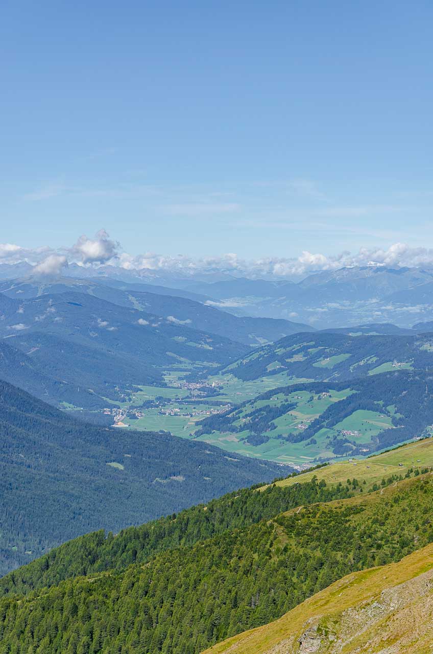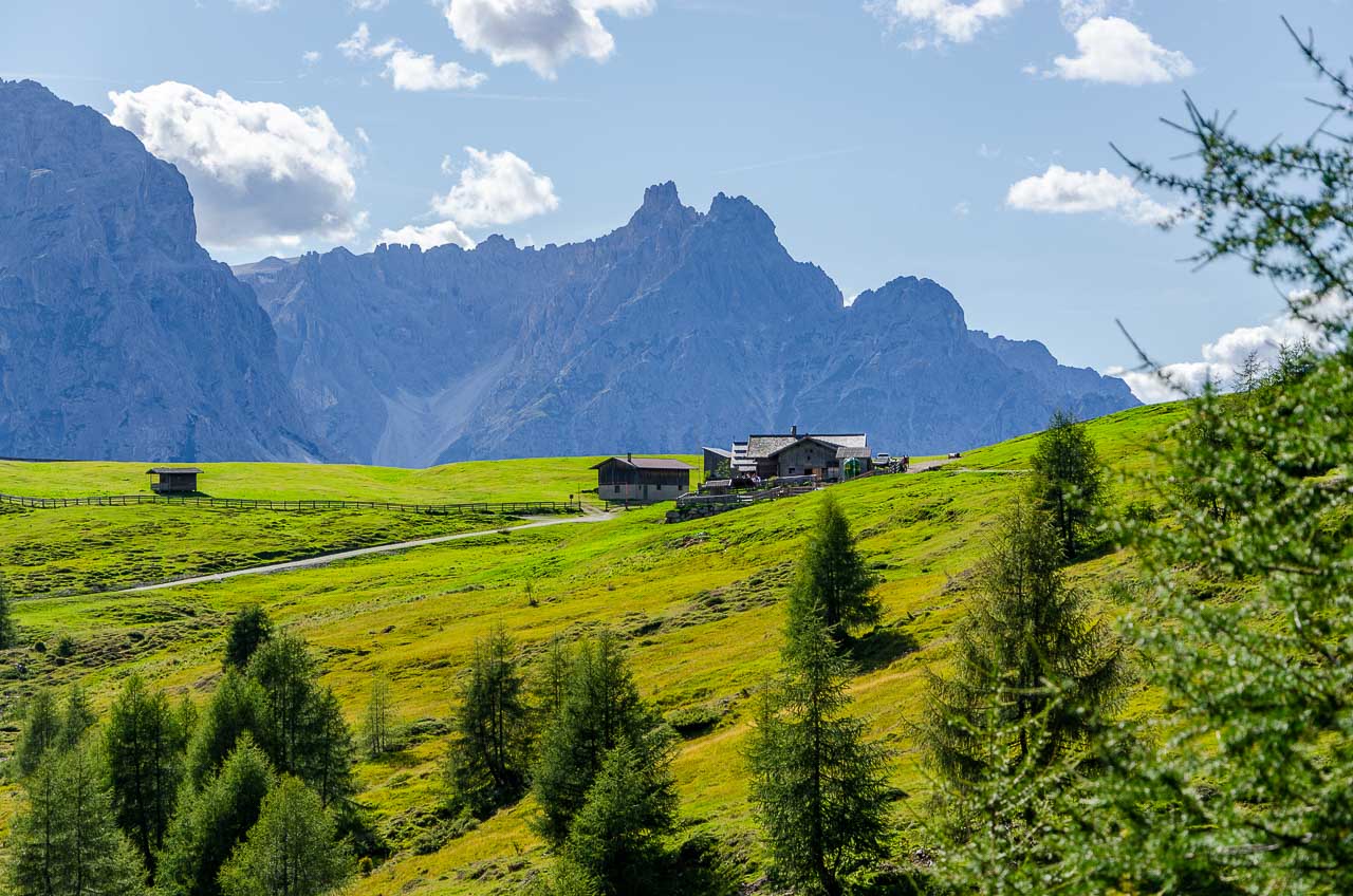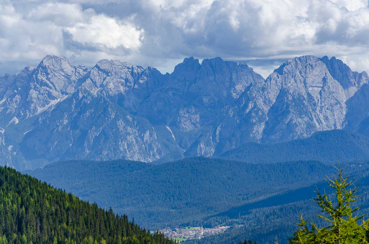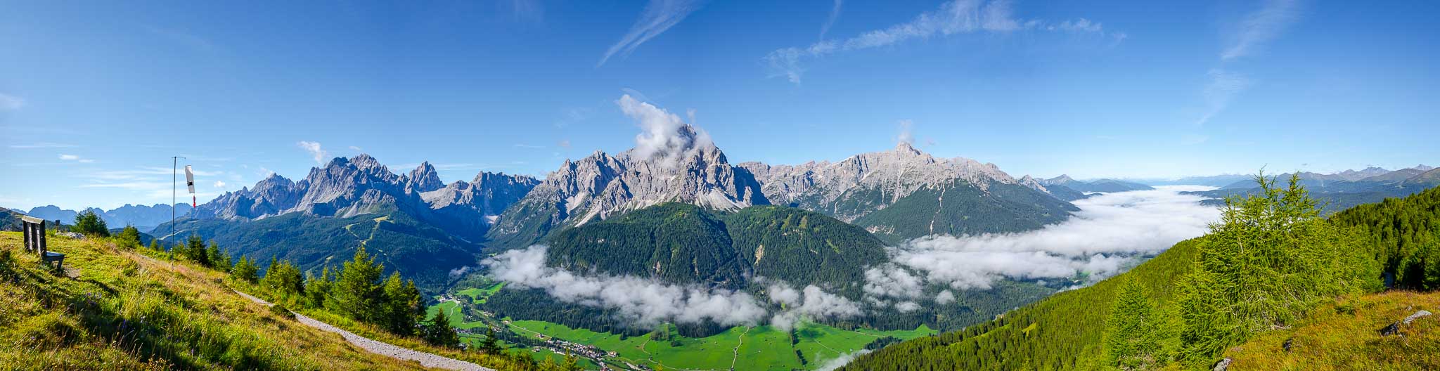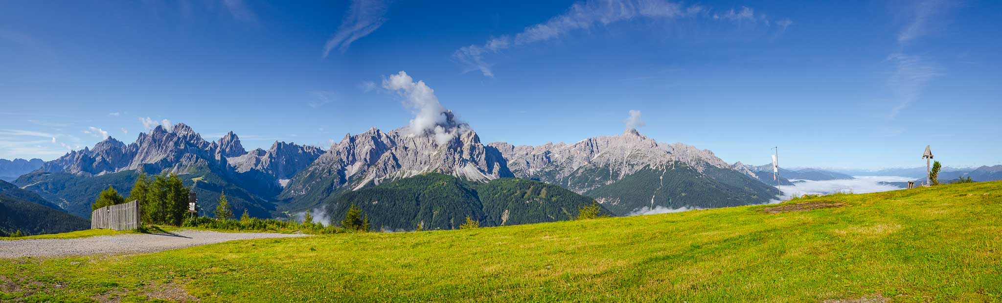 Von der Bergstation der Helm-Seilbahn aus führt rechts ein Schotterweg zur Hahnspielhütte (Gallo Cedrone al Monte Elmo) auf 2.200 m. Kurz davor können wir nicht anders und müssen das herrliche Panorama genießen und natürlich auch fotografisch festhalten.