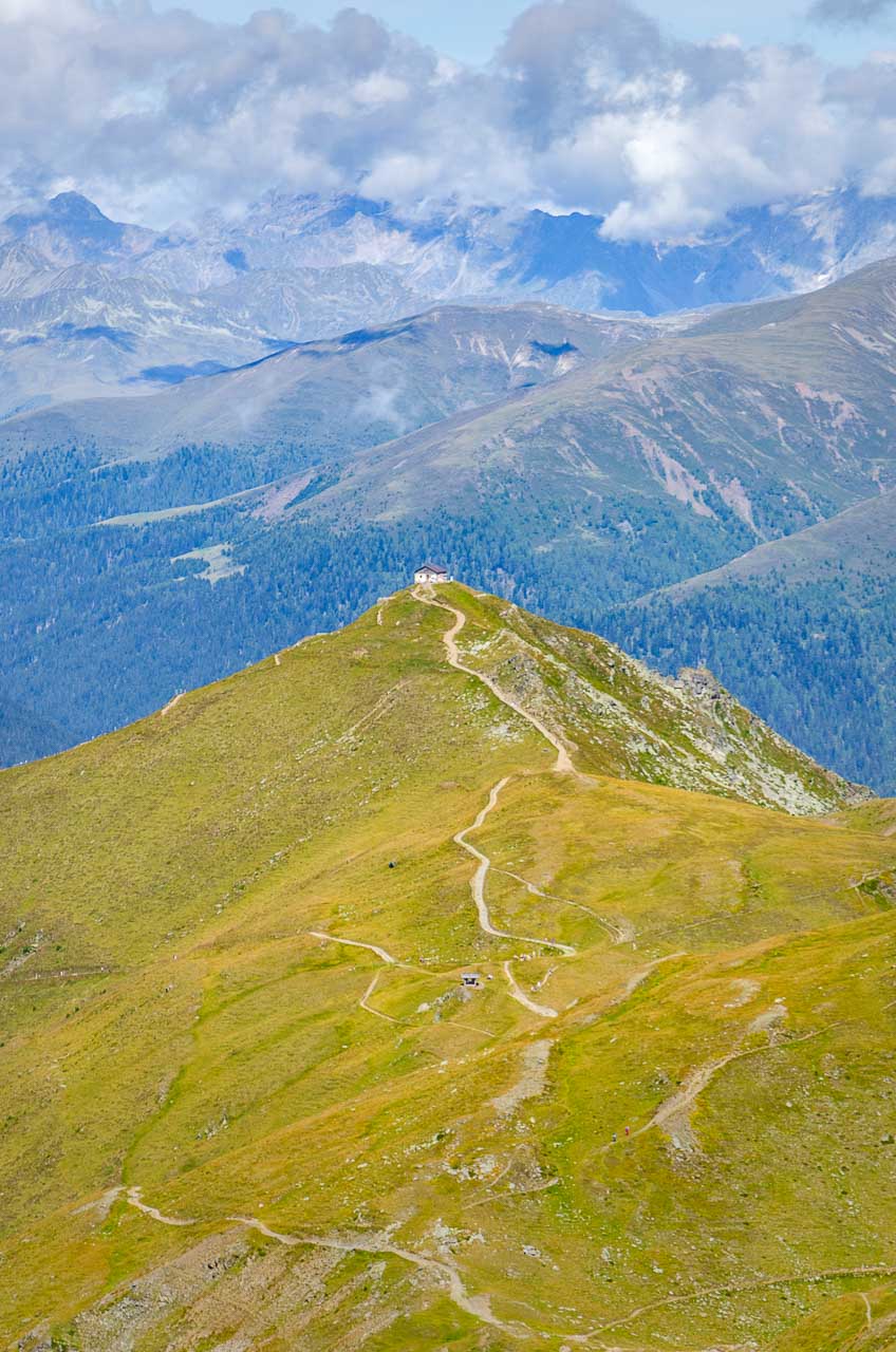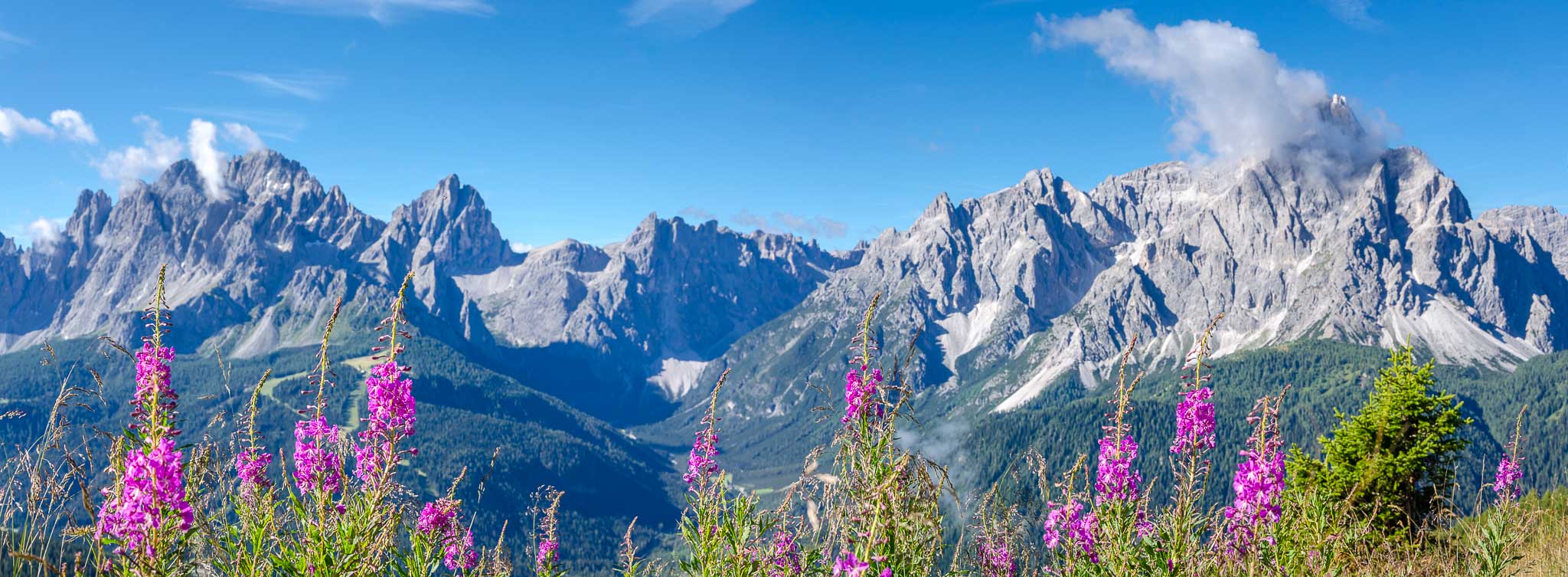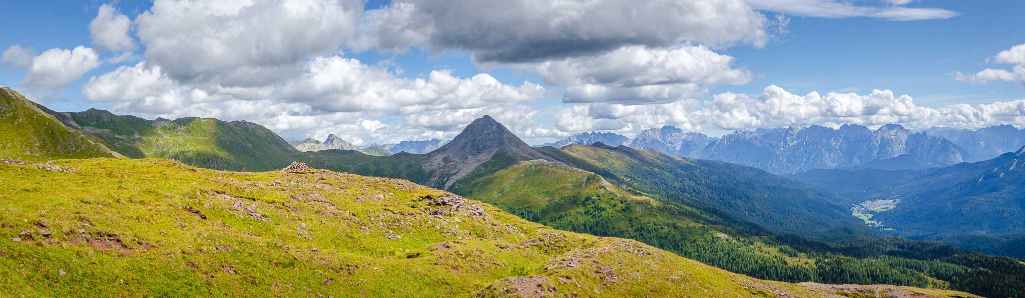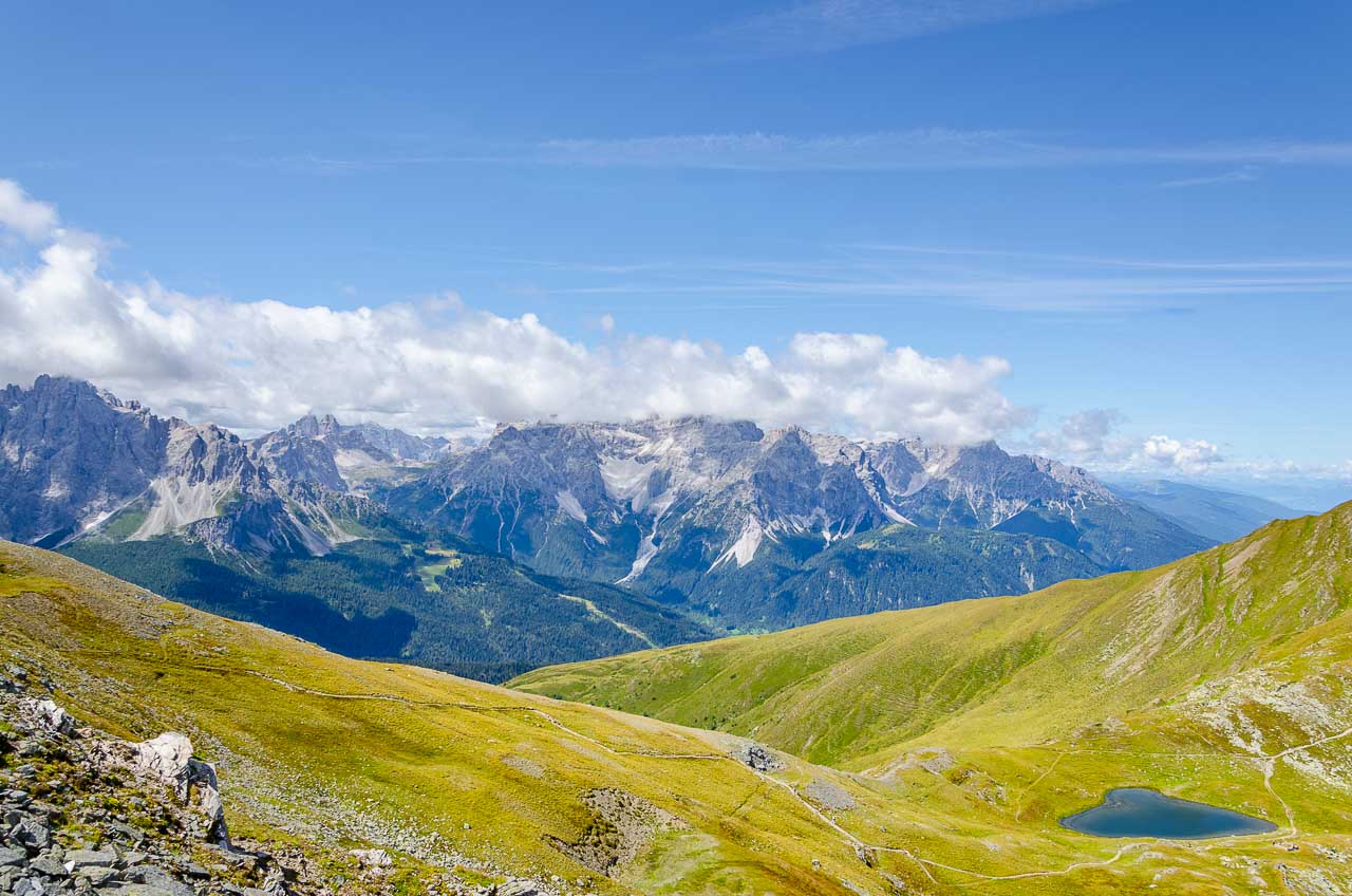 Von der Bergstation der Helm-Seilbahn aus führt rechts ein Schotterweg zur Hahnspielhütte (Gallo Cedrone al Monte Elmo) auf 2.200 m. Kurz davor können wir nicht anders und müssen das herrliche Panorama genießen und natürlich auch fotografisch festhalten.