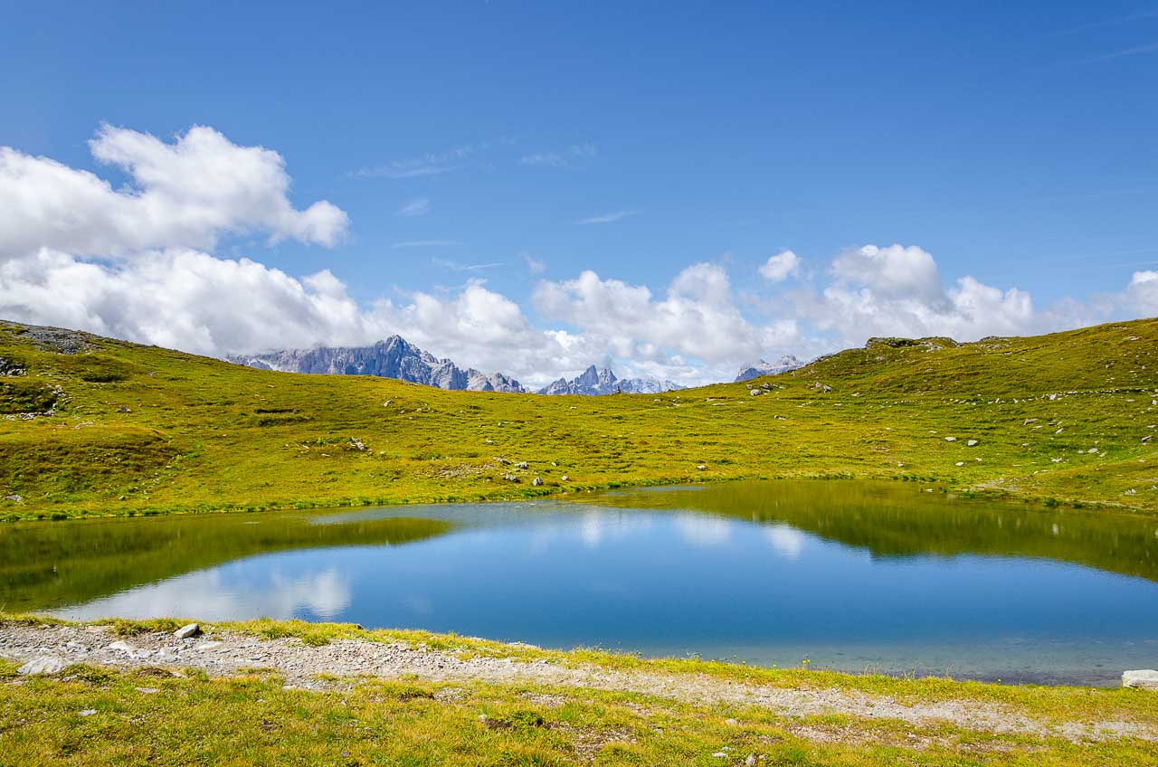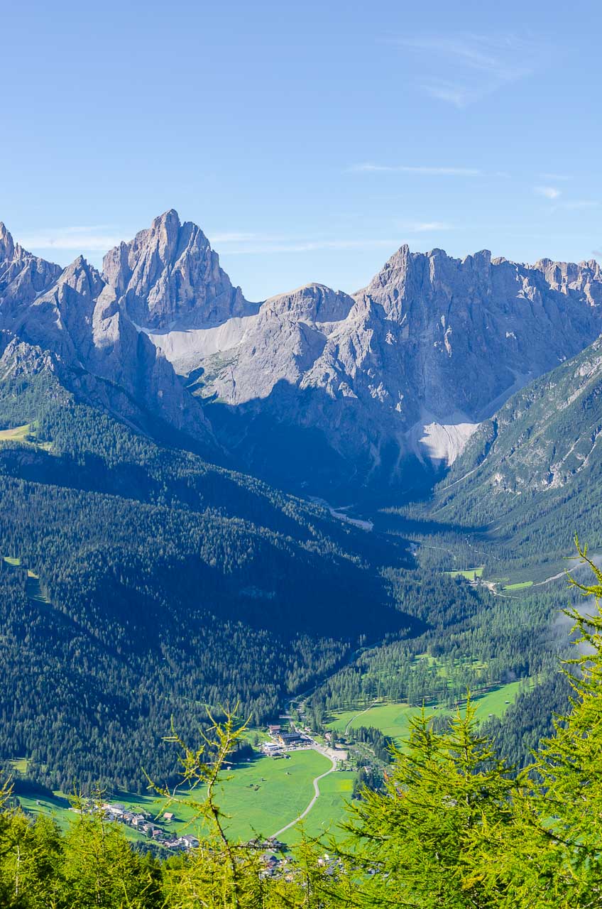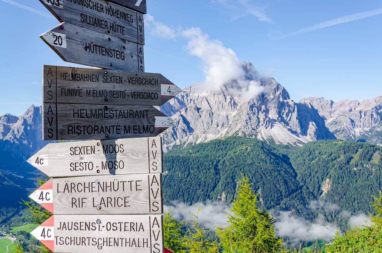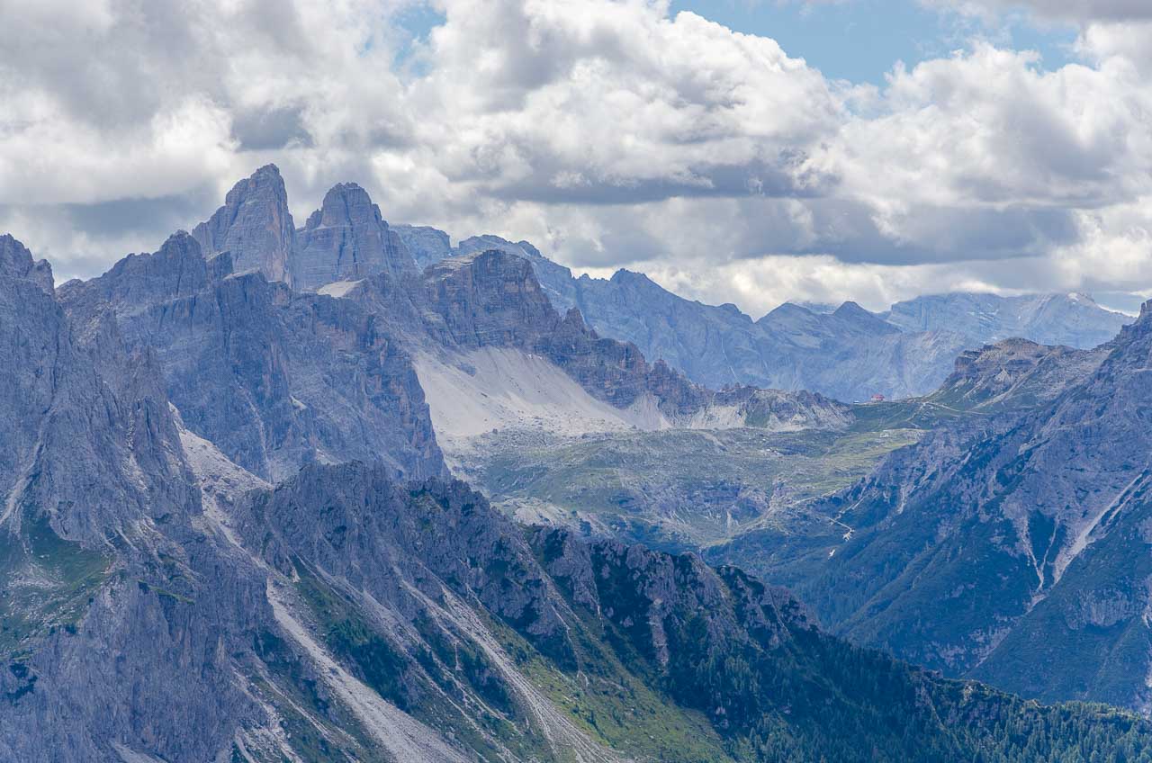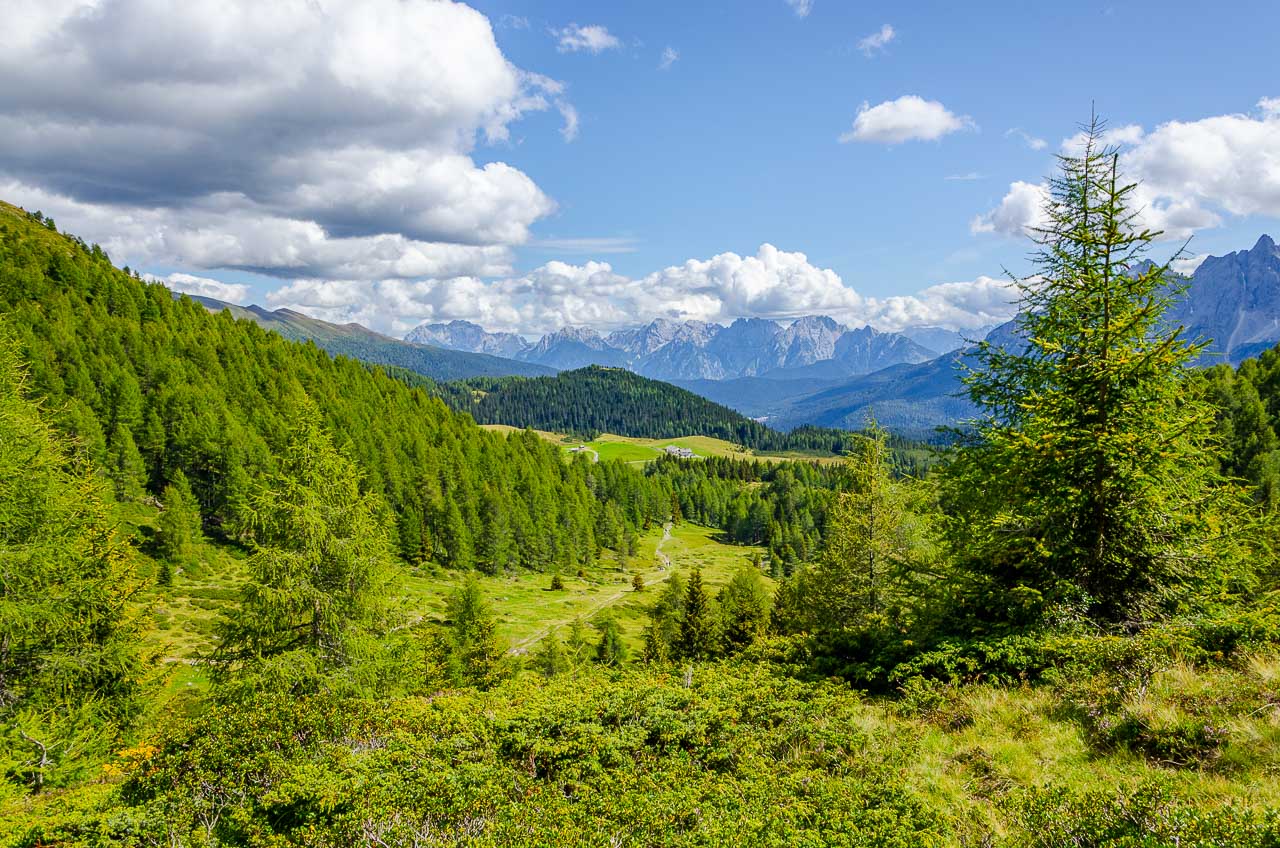 Über den guten Weg geht es aussichtsreich auf die Sextner Dolomiten zu bis zu einem Blockhaus, an dem eine Panoramatafel befestigt ist, auf der die Gipfel der Sextner Dolomiten benannt sind: Cima Bagni (2.983 m), Neunerkofel / Pala di Popèra (2.582 m), Hochbrunner Schneid / Monte Popèra (3.046 m), Zehnerkofel oder Rotwandspitze / Croda Rossa (2.965 m), Elferkofel / Cima Undici (3.098 m), Zwölferkofel / Cima Dieci oder Croda dei Toni (3.084 m), ganz im Hintergrund sieht man die Spitze des Dolomitenkönigs, des Antelao (3.264 m), den Einserkofel / Cima Una (2.698 m), die Oberbachernspitze / Croda Fiscialina (2.667 m), im Hintergrund die Gruppe der Marmarole, dann der Paternkofel / Monte Paterno (2.722 m), die Drei Zinnen / Tre Cime mit Kleine Zinne / Cima Picola (2.857 m), Große Zinne / Cima Grande (2.999 m), Westliche Zinne / Cima Ovest (2.973 m), Schusterplatte / Lastron dei Scarperi (2.957 m), Dreischusterspitze / Cima Tre Scarpieri (3.152 m), Gsell / Monte Casella (2.857 m) und Haunold / Monte Baranci (2.966 m).