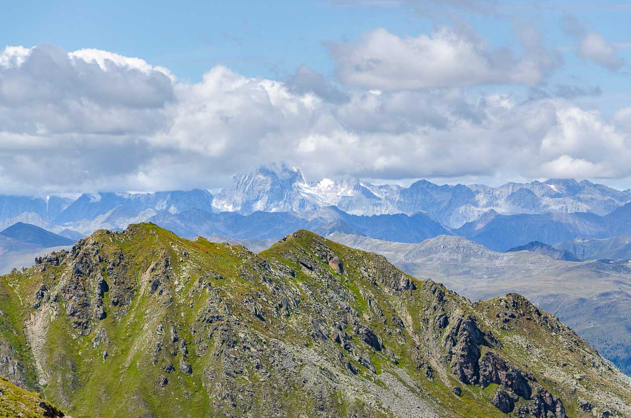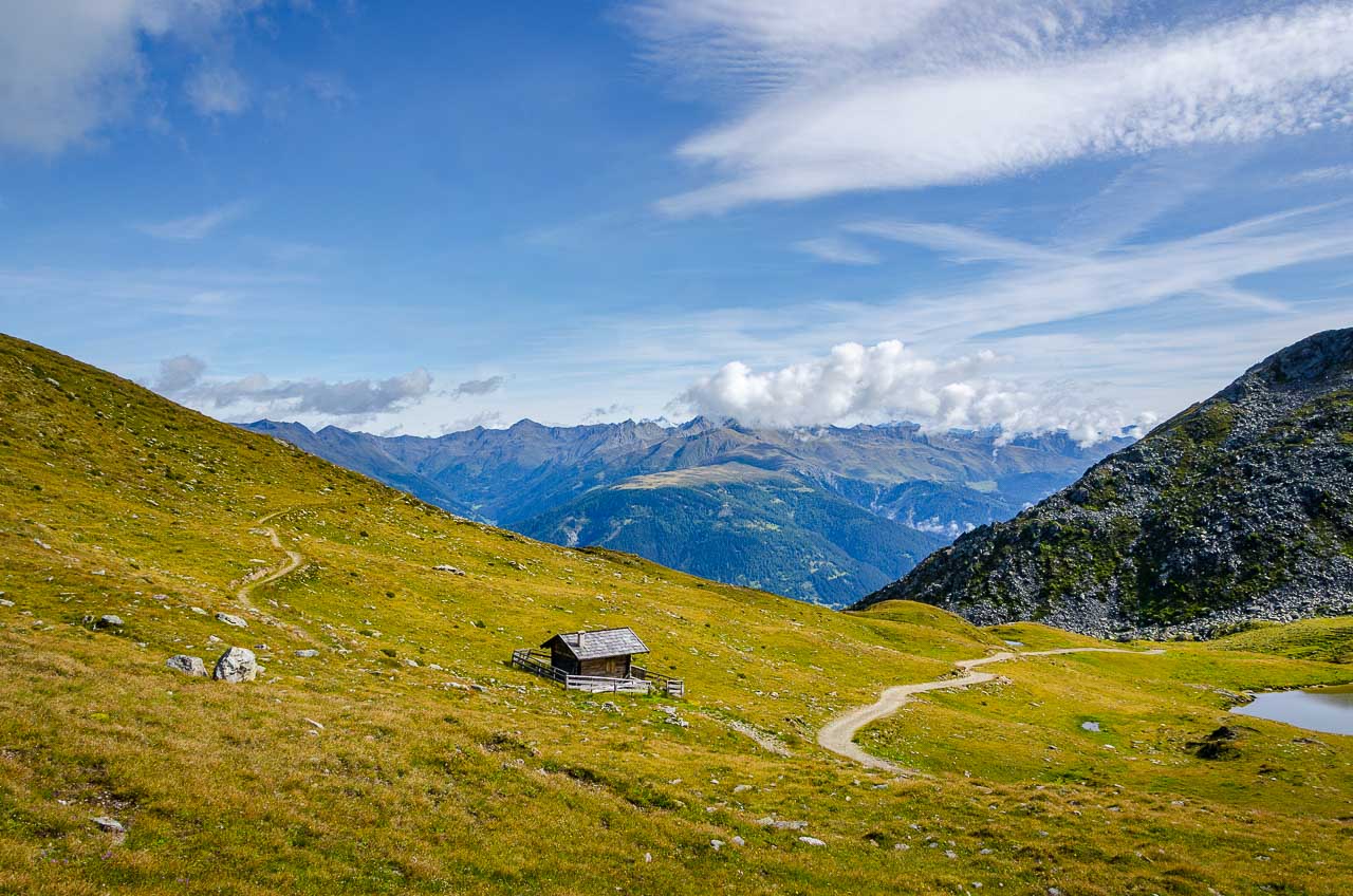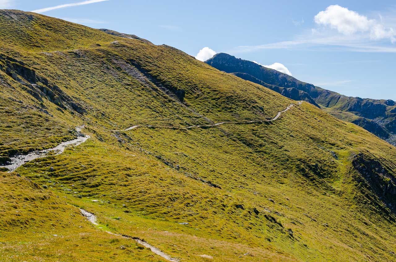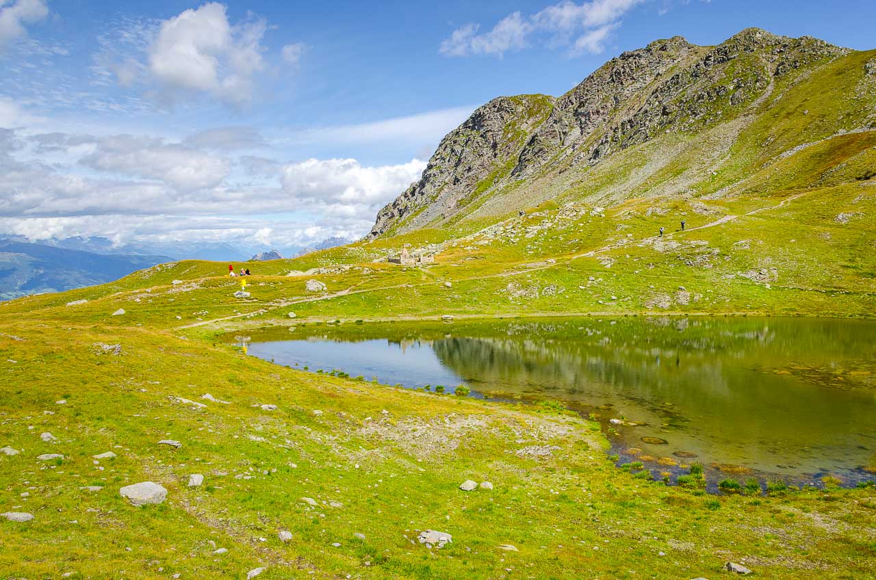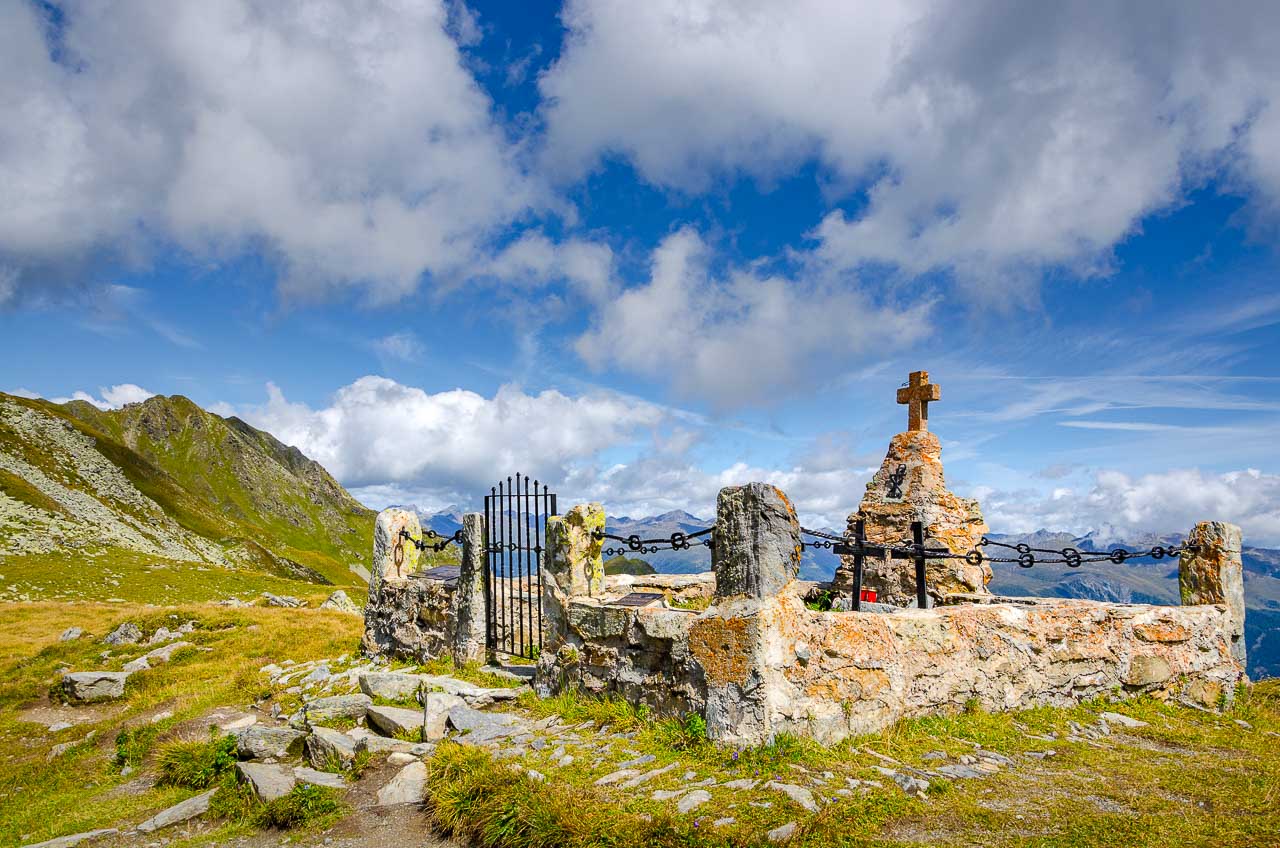 Vom Hornischegg wollte ich eigentlich zur Hollbrucker Spitze hinaus gehen. Das ist aber nur durch Hin und Zurück machbar. Darum lassen wir es lieber und wandern weiter bis zum Hochgräntenjoch, wo sich ein Kriegerfriedhof und der Hochgränten See befinden.