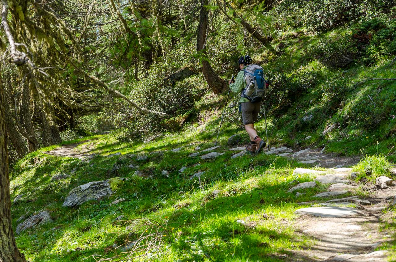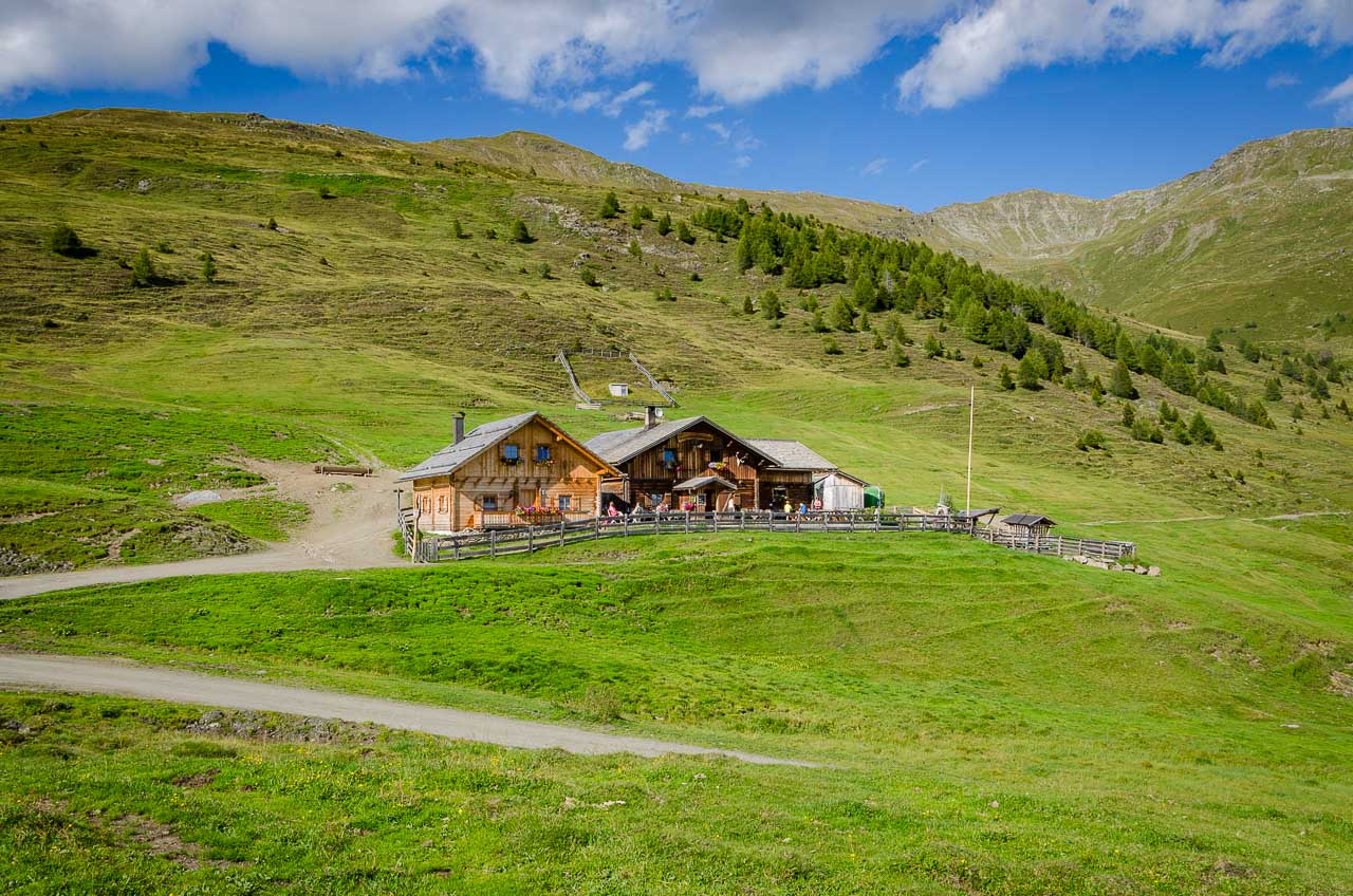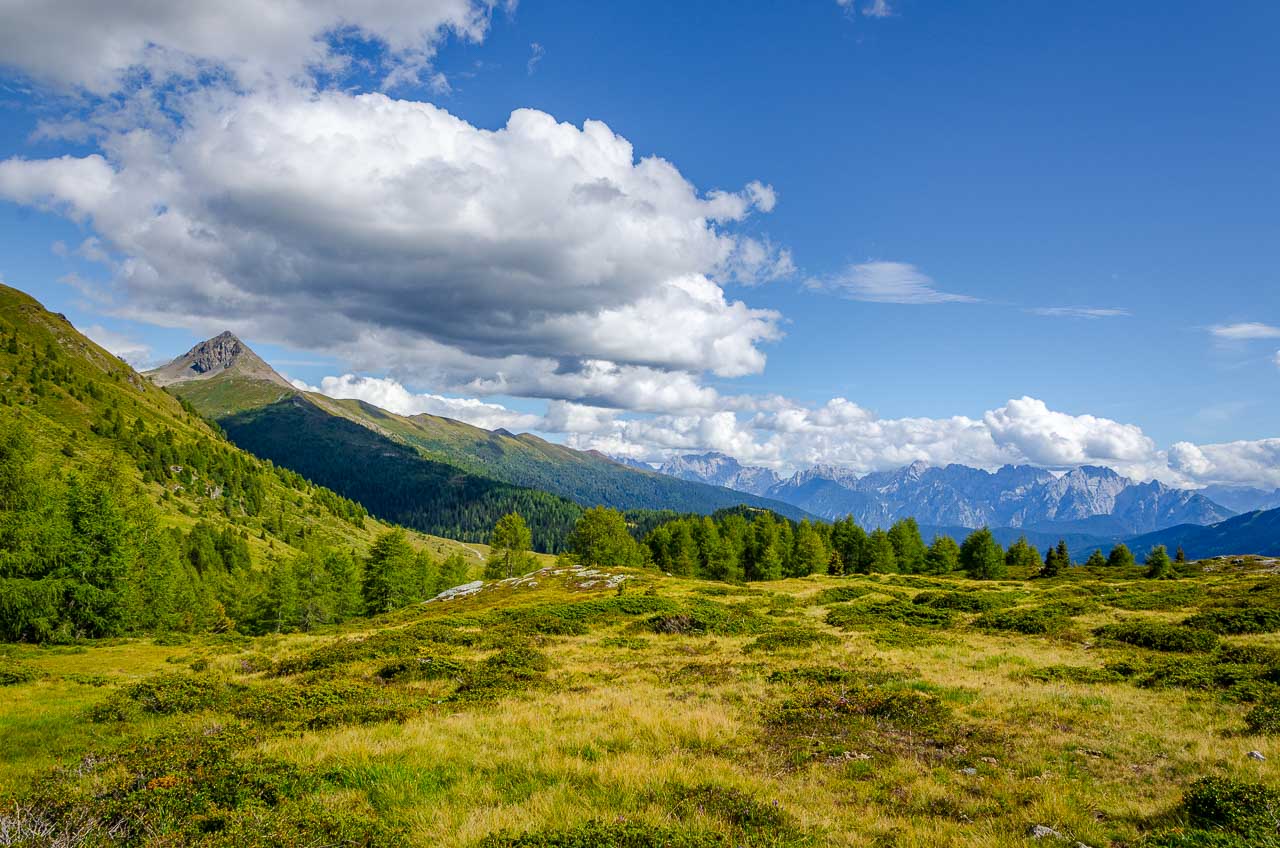 Natürlich müssen wir auch zum Gipfel des Roteck hinauf, einen roten Stein holen. Anschließend geht es auf dem Steig Nr. 14 über Almwiesen hinunter bis zur Baumgrenze und der Kreuzung mit dem Steig Nr. 13. Hier könnte man links zur Nemes Hütte weiterwandern, wir müssen aber rechts in Richtung Klammbachhütte. Wir begegnen mehreren italienischen Spaziergängern, welche als Wanderer getarnt mit Kind und Kegel über den scheinbar beliebten Almenweg durch den Purnwald hindurch wandern.