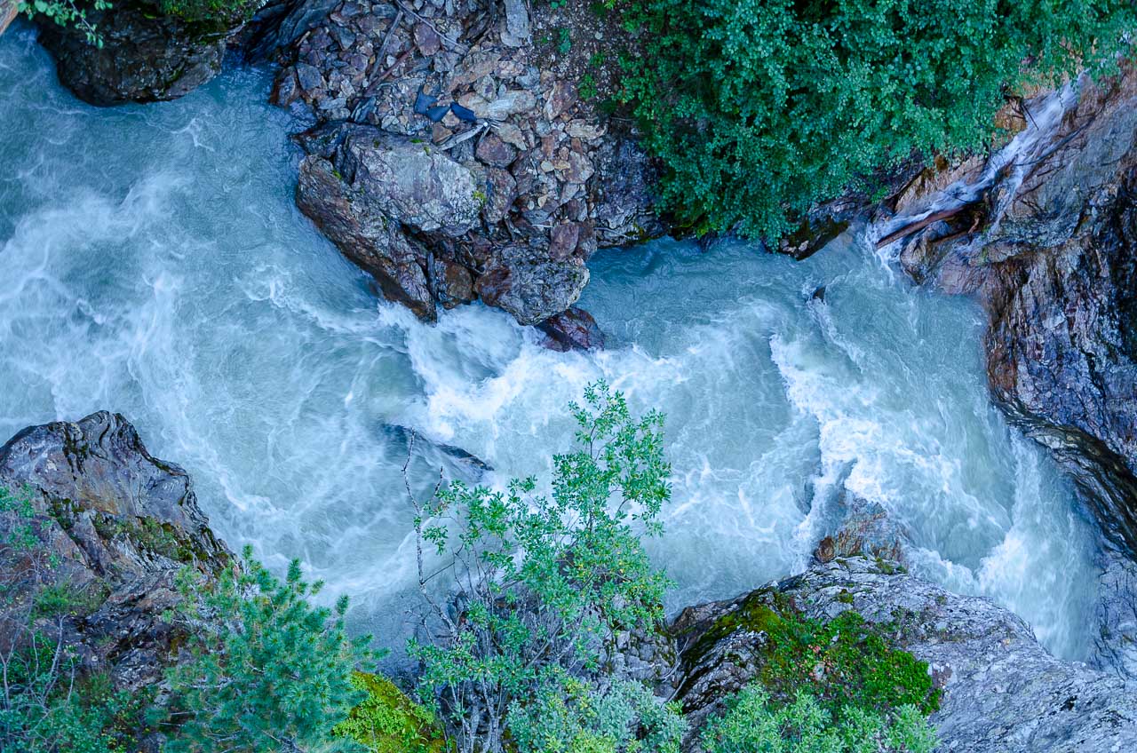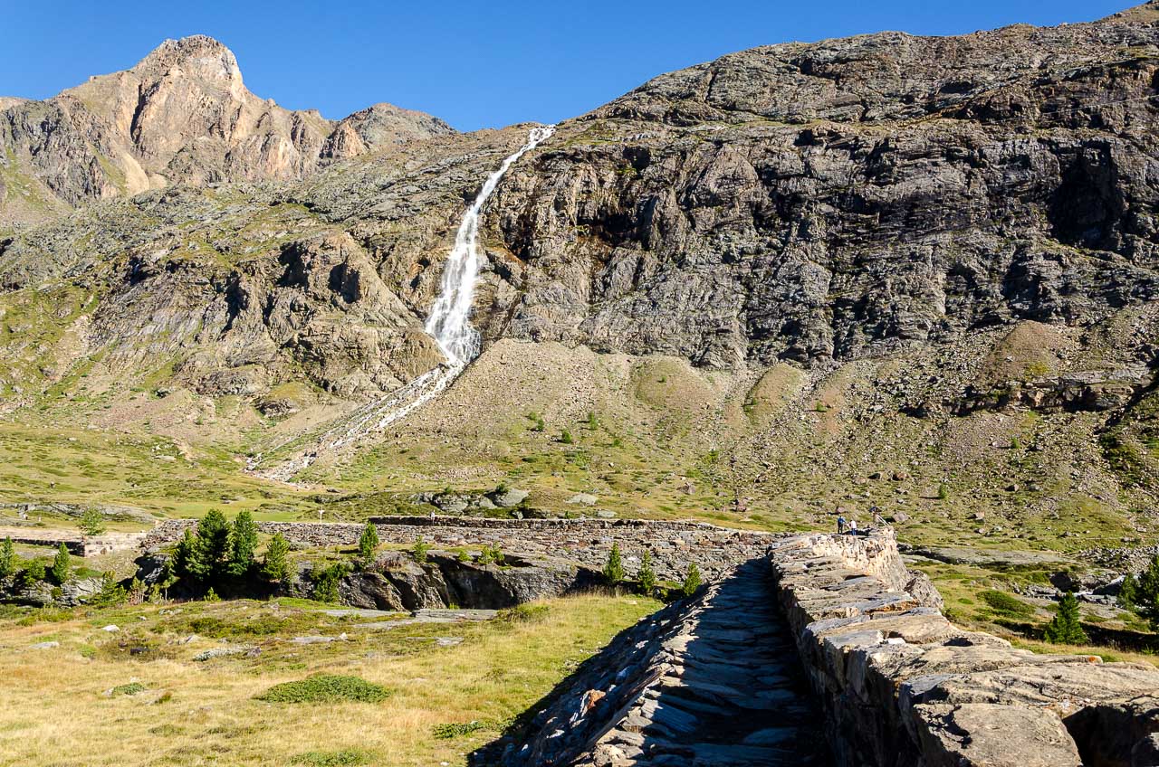 Entlang der Plima Mauer überqueren wir den Plima Bach und wandern zuerst über moorige Wiesen, dann mit Tiefblick ins Bachbett des Plima Baches und schließlich durch lichten Wald bis zu unserem Ausgangspunkt. Dabei kommen wir am einst prachtvollen, heute verfallenen Hotel Paradiso del Cevedale vorbei und überqueren schließlich den tief gelegenen Plima Bach.