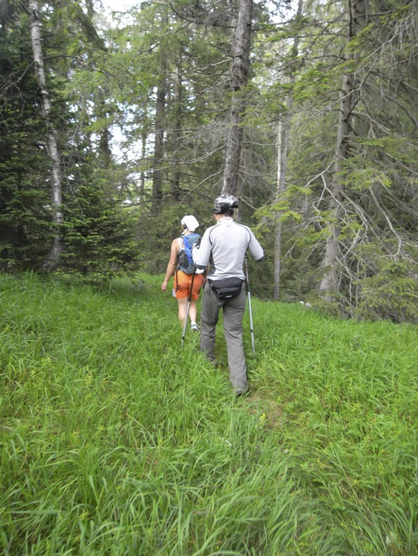 Da wir nicht den exakt gleichen Rückweg antreten wollen, sind wir so verwegen dem Uwe zu glauben, dass er sich noch an all die Schleichwege und Rehpfade seiner Kindheit erinnern kann. Wir beschließen zum Lawinenspitz hinaus zu gehen und dann über einen mehr oder weniger als Rehsteig zu bezeichnenden Pfad am Grat entlang zurück zur Mendel zu wandern.