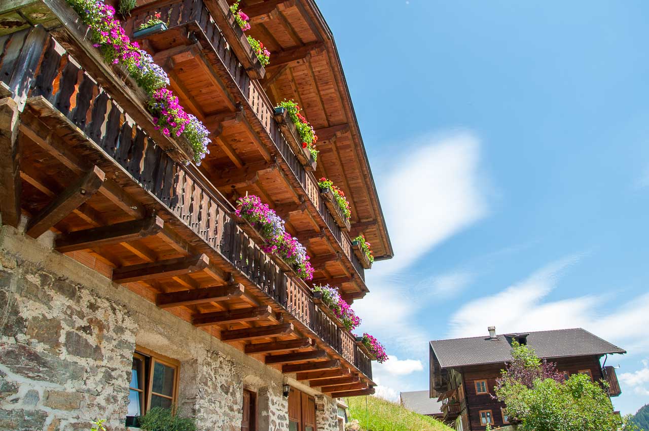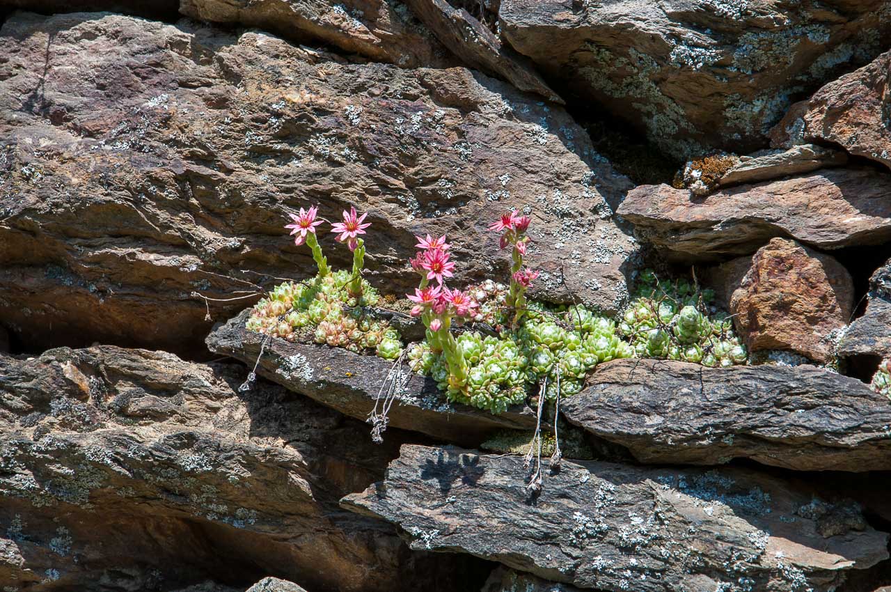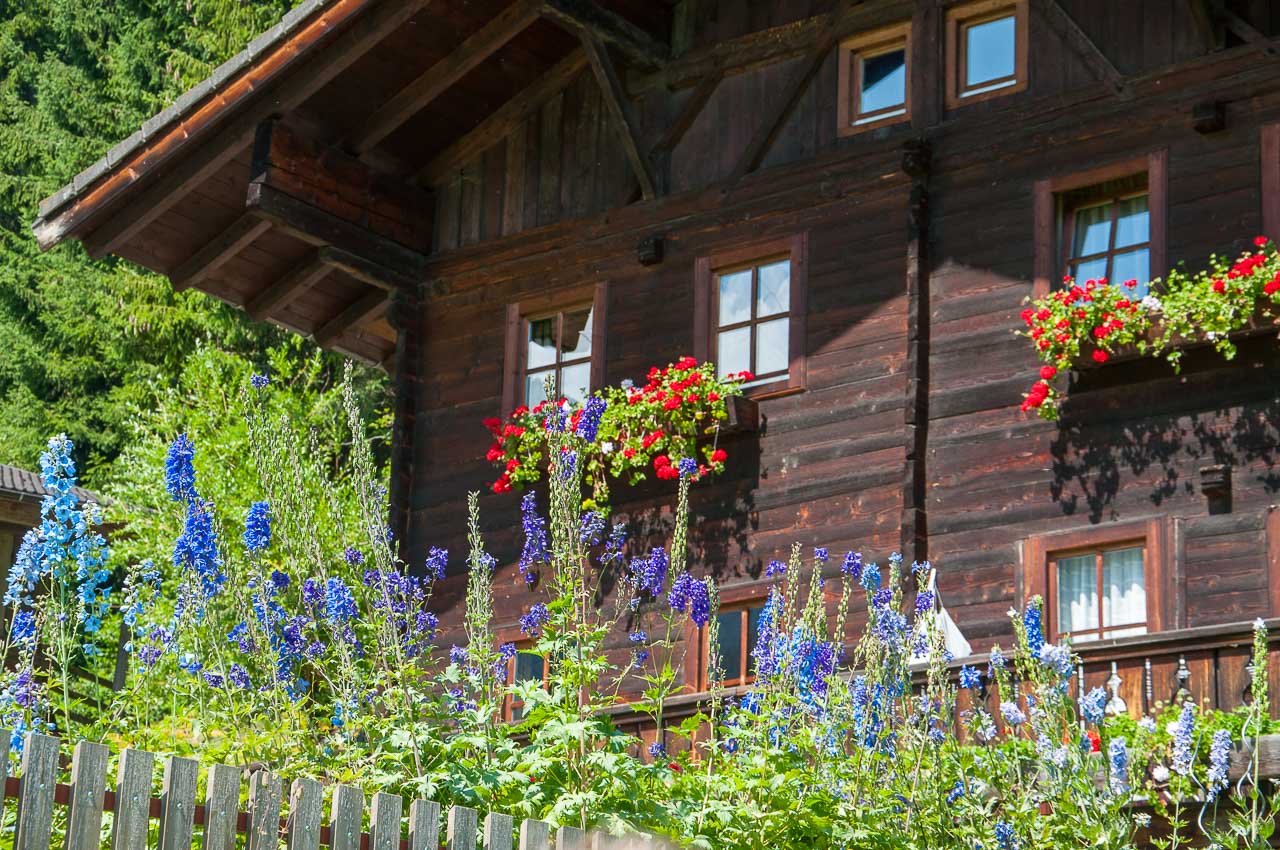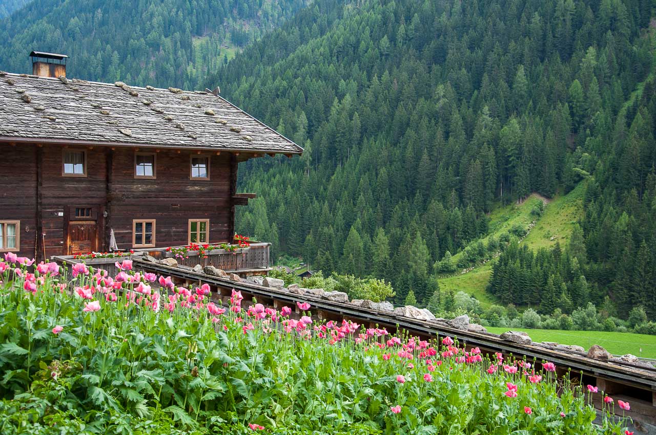 Noch haben wir zwar keinen Mohn gesehen, der Ultner Höfeweg ist aber auch so unbedingt sehenswert. Das tiefbraune Holz der Bauernhöfe, die Holzschindel gedeckten und mit Steinen beschwerten Dächer und die farbenprächtigen Bauerngärten geben wirklich ein tolles Bild ab. Dem Wiesenweg durch die Gehöfte folgend treffen wir links und rechts des Weges eine große Artenvielfalt an Pflanzen an. Und jetzt kommt auch das erste Mohnfeld in Sicht. Die Schnellsten sind wir deshalb nicht gerade.