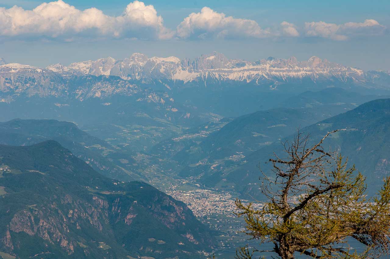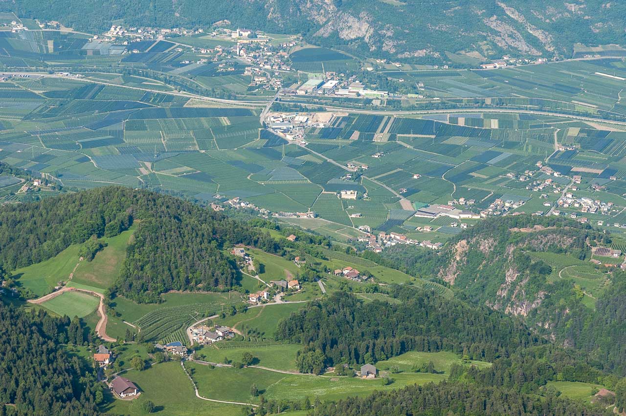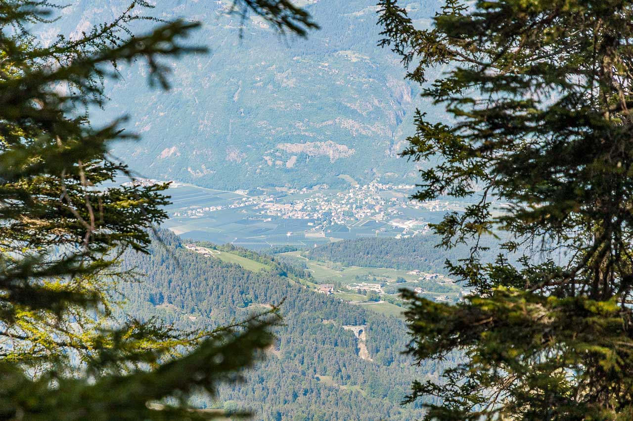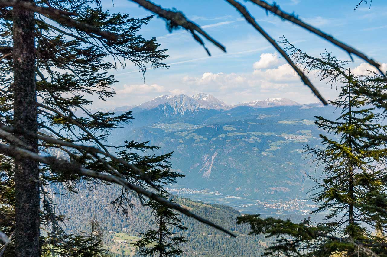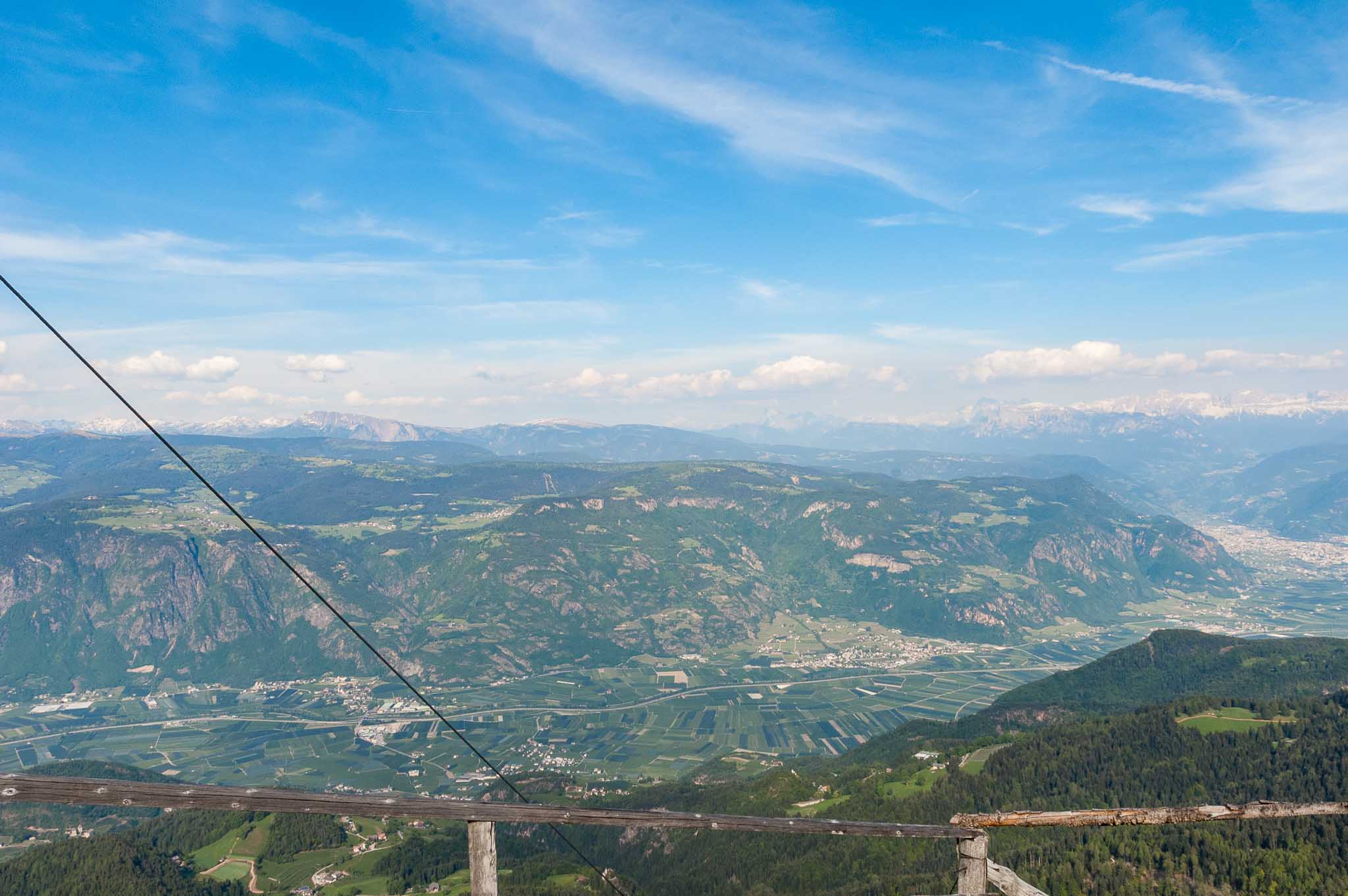 17.10 Uhr, das Schönegg überrascht mit einem Gipfelkreuz und einem seinem Namen entsprechenden Ausblick. Kurze Rast mit Fotopause. Wir befinden uns am nördlichen Ende des Mendelkammes und haben einen herrlichen Ausblick auf das Etschtal. In südöstlicher Richtung sehen wir bis nach Bozen mit Schlern und Rosengarten dahinter, in nördlicher Richtung über Meran bis zur Texelgruppe. Unter uns liegen Grissian, Prissian und Tisens.