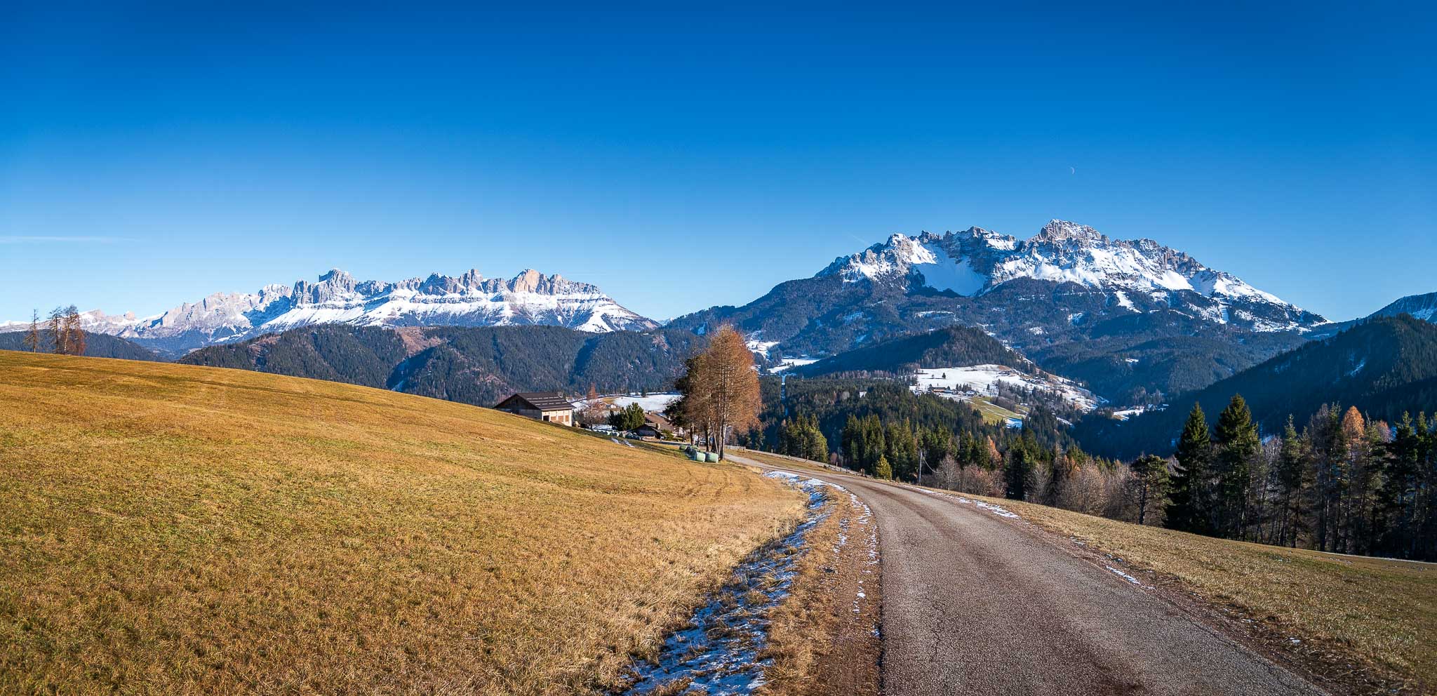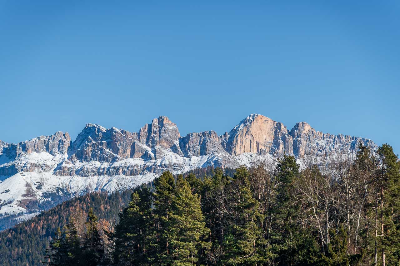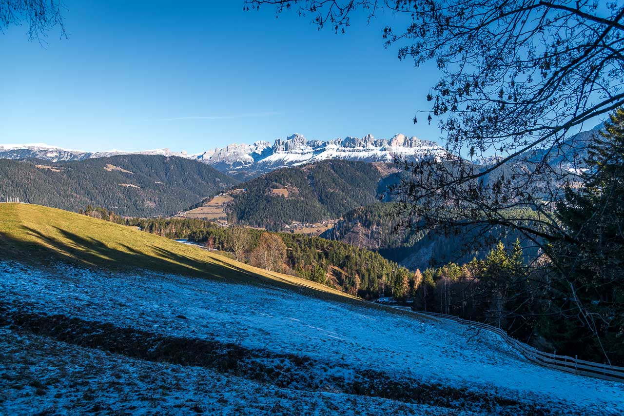Nun folgen wir der Beschilderung Richtung St. Helena, wandern bis zur Landesstraße 72, begleiten sie ein paar Meter und biegen dann links in den schönen Panoramaweg ein. Er führt uns um den St.-Helena-Hügel herum, vorbei an einzelnen Hofstellen. Der Panoramaweg verdient seinen Namen zurecht: Die Spitzen der Rosengartengruppe und des Latemars begeistern. Heute sind sie – im Unterschied zu vor 5 Monaten – weiß. Ein traumhafter Dolomitenblick, der seinesgleichen sucht.
