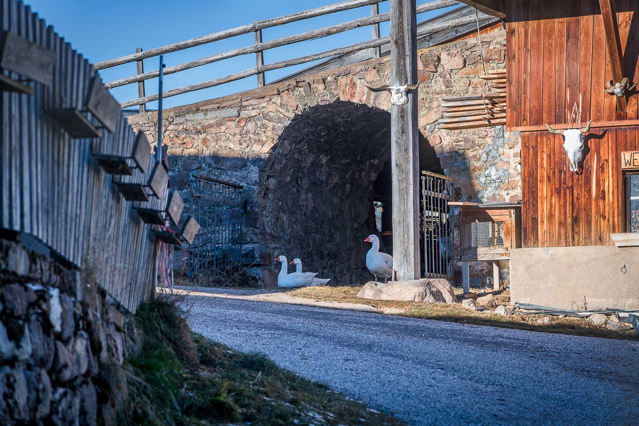 Heute ist Deutschnofen unser Ziel, denn die Tota wird besucht. Trotzdem darf unsere tägliche, kurze Mittagsrunde nicht fehlen. Also spazieren wir vom Kreisverkehr bei der Dorfeinfahrt zuerst hinauf in die Handwerkerzone und dann hinüber zum Hotel Pfösl. Unser Weg führt hinter dem Hotel vorbei, direkt an einem Unterstand für graue Vierbeiner. Anna muss natürlich die Eselchen streicheln.
