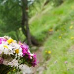 Eine größere Lichtung lädt fast zum Verweilen ein, da bemerke ich über uns ein Auto vorbei fahren. Scheinbar werden wir nun eine Straße queren. So ist es. Schon darauf eingestellt, der Zivilisation ins Auge blicken zu müssen, überrascht die kleine Almenstraße mit blumigen Magerwiesen rechts und links des Weges. Selten so viele duftende Wiesenblumen gesehen. Die beste Ehefrau von allen lässt es sich nicht nehmen, einen gewaltigen Strauß zu pflücken. Leider kommt sie dann auf die Idee, den Strauß an meinem Rucksack zu befestigen, was mir einen extrem blumigen Duft beschert und eine nicht so schöne allergische Reaktion hervorruft. Heuschnupfen lässt grüßen.
