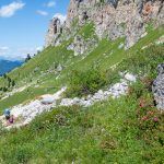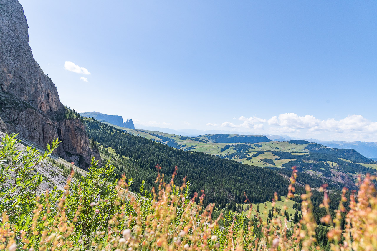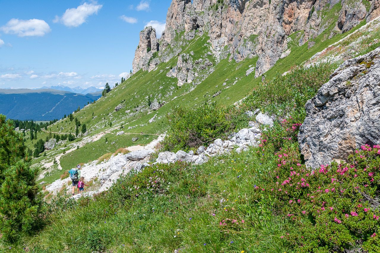 Wir sind nicht allein unterwegs. Der königliche Wanderweg wird heutzutage vom Fußvolk bevölkert, und zwar im wahrsten Sinne des Wortes. Kein Wunder, der sich durch Grashänge schlängelnde Pfad könnte für Dolomitenliebhaber, wie es der König einer war, kaum schöner sein. Am Start haben wir auf die Geislerspitzen, die Puez-Spitze und den Sellastock geschaut. Jetzt wandern wir mit der Marmolata im Rücken und den Blick auf die Rosengartengruppe gerichtet, Richtung Seiser Alm. Zu unserer Rechten begleitet uns der mächtige Felsstock des Plattkofels, links geht es steil über Grashänge, hinunter ins Fassatal. Trotzdem ist der Wanderweg unschwierig. Anna und Hannes haben Freude daran allein, parallel zu uns, auf ausgetretenen Kuhpfaden wandern zu dürfen.