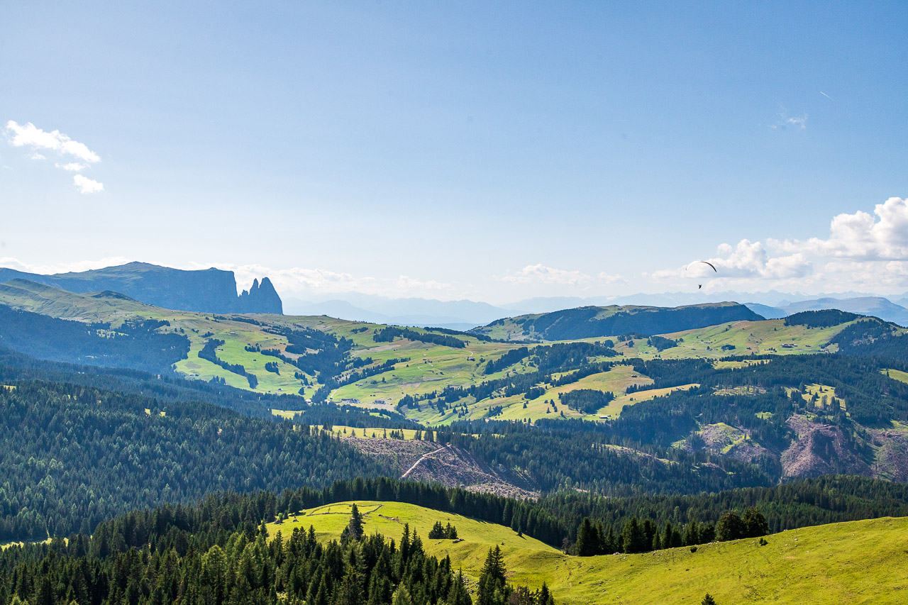 Von unserem Mittagsplatz haben wir nur die Roßzähne gesehen, nun die Plattkofelhütte hinter uns lassend, kommt die typische Silhouette des Schlerns mit Petz auf dem Rücken und den vorgelagerten Spitzen Burgstall, Santner und Euringer zum Vorschein. Über den Steig Nr. 527 geht es oberhalb der Murmeltierhütte nordwärts. Der Panoramablick auf die Seiser Alm wird mit jedem Schritt freier.