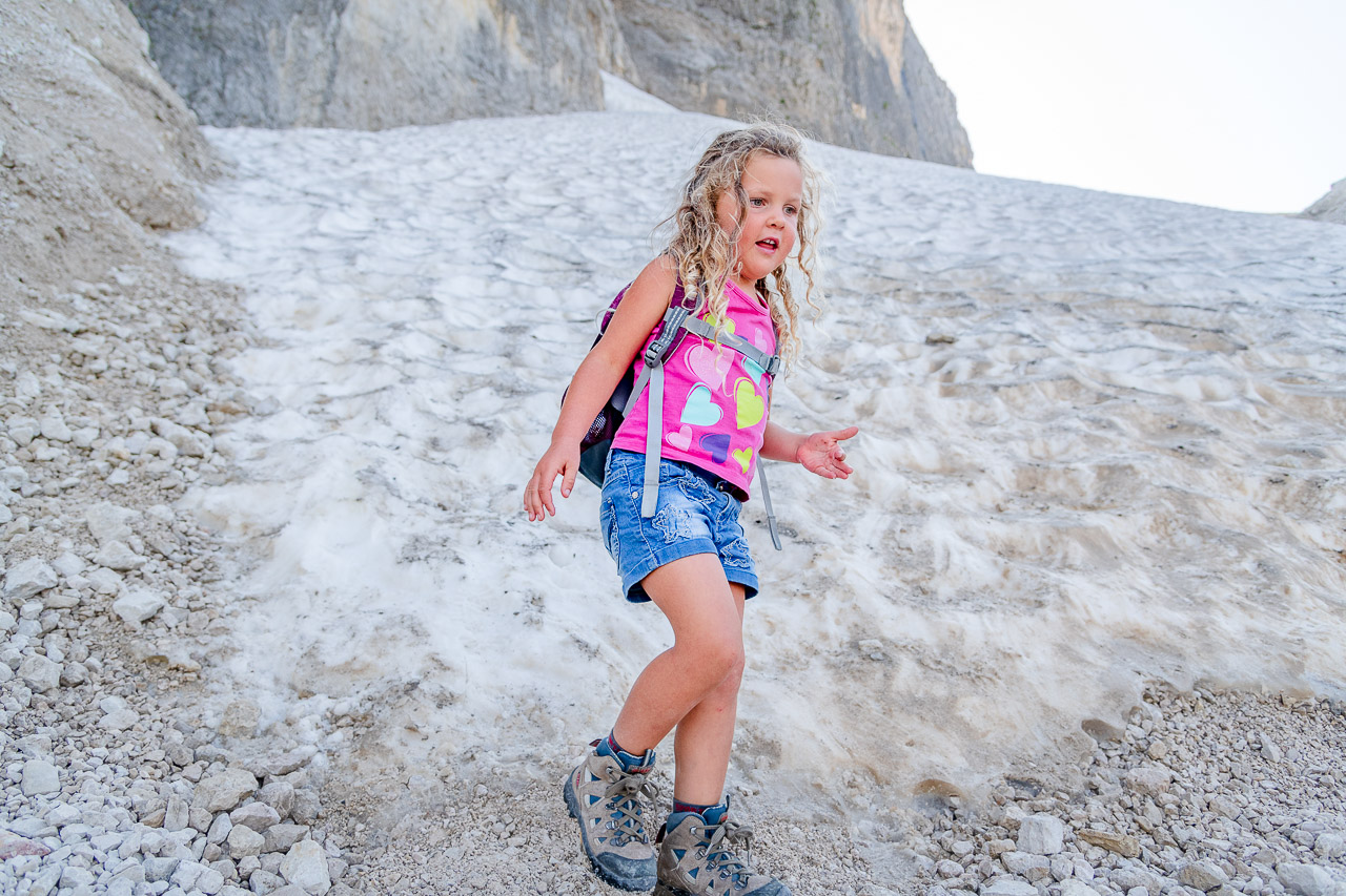 An der imposanten Nordwand des Langkofels entlang folgen wir dem Steig Nr. 526A. Ein Schneefeld versperrt den Weg. Das circa 3 m starke Feld muss umgangen werden. Dafür dürfen wir es am unteren Rand angreifen. Schnee im August, das ist für Vierjährige natürlich ein Highlight!