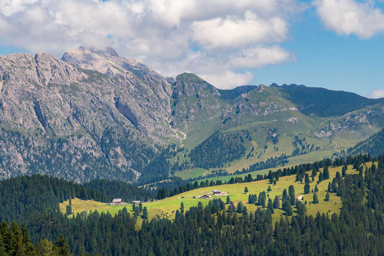 Wir halten uns etwas länger als normal auf. Klar bei dem Panorama! Brogles Alm, Pana-Scharte, die hinauf auf die Seceda führt, Große Fermada, Mittagsspitz, Mittagscharte, Sas Rigais (3.27 m), Forchetta und in der Ferne etwas links der Geislerspitzen die beiden Almen Geisleralm und Gschnagenhardter Alm.