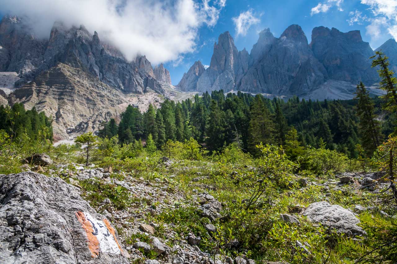 Die Landschaft am Fuße der Geislergruppe entlang des Adolf Munkel Weges ist geprägt von lichten Kiefern und Latschenwald als auch von Geröllfeldern.