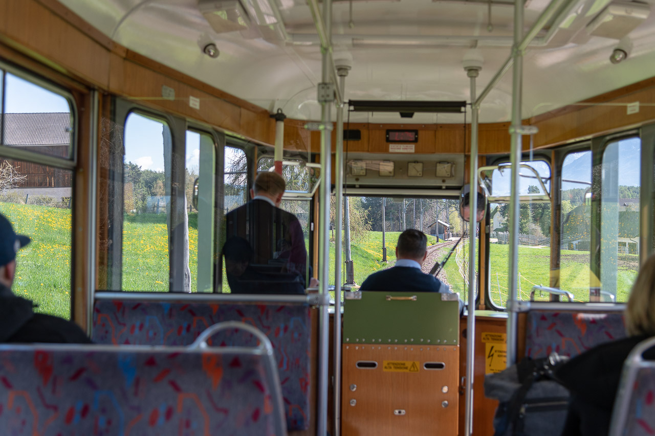 Von Oberbozen geht es vorbei an den Bedarfshaltestellen Linzbach und Rinner nach Wolfsgruben und weiter nach Lichtenstern. Hier befindet sich eine Ausweiche. Der uns entgegen gekommene Zug besteht aus einer modernen Lokomotive mit einem Wagon. Wir sind total froh, dass wir zufällig in der richtigen Bahn, im Esslinger Triebwagen, gelandet sind. Die Panoramasicht ist zwar die gleiche wie bei den neueren Bahnen, aber das Bahnerlebnis ein ganz anderes. Noch schöner wären sicherlich der Triebwagen 105 „Alioth“ gewesen, aber ob der bei normalen Fahrten überhaupt fährt weiß ich nicht.