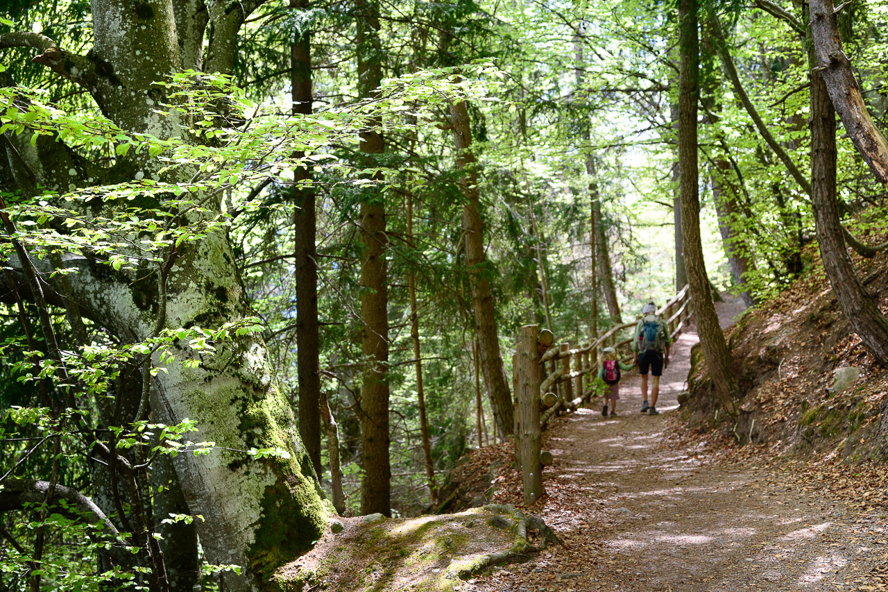Das frische Grün der eben gesprossenen Buchenblätter funkelt über unseren Köpfen. Sitzbänke entlang des Waldweges laden zum Rasten ein. Wir haben dafür leider keine Zeit. Um 14.10 Uhr fährt die Rittner Bahn von Klobenstein ab. Sie fährt zwar alle halbe Stunde, somit entsteht für normale Wanderer kein Stress, aber ich habe einen Termin in Oberbozen. So müssen wir leider recht zügig die Fennpromenade durchschreiten um anschließend durch Klobenstein hindurch pünktlich hinauf zur Rittner Bahn zu gelangen.