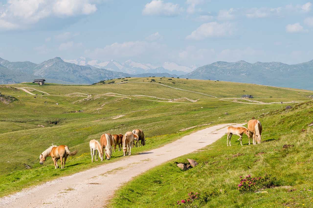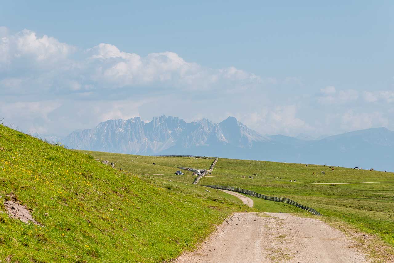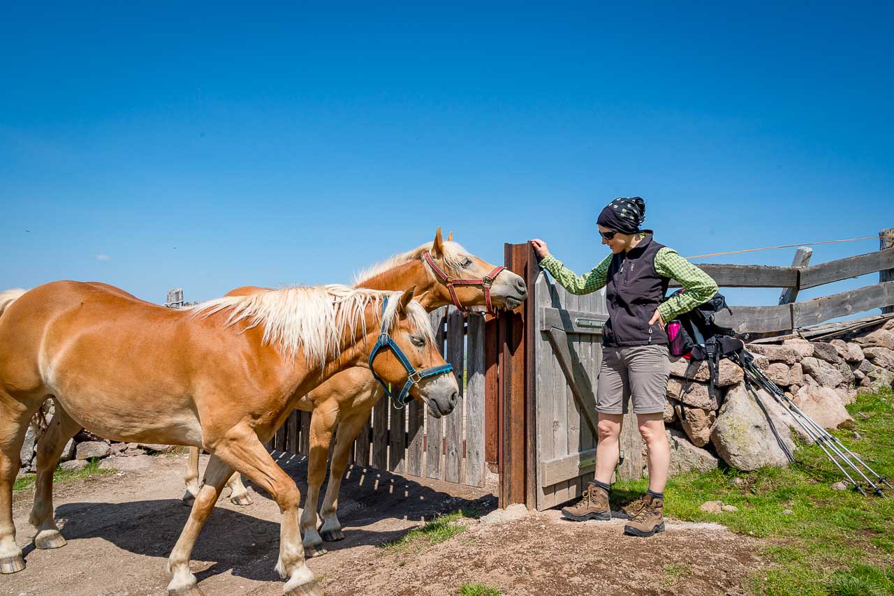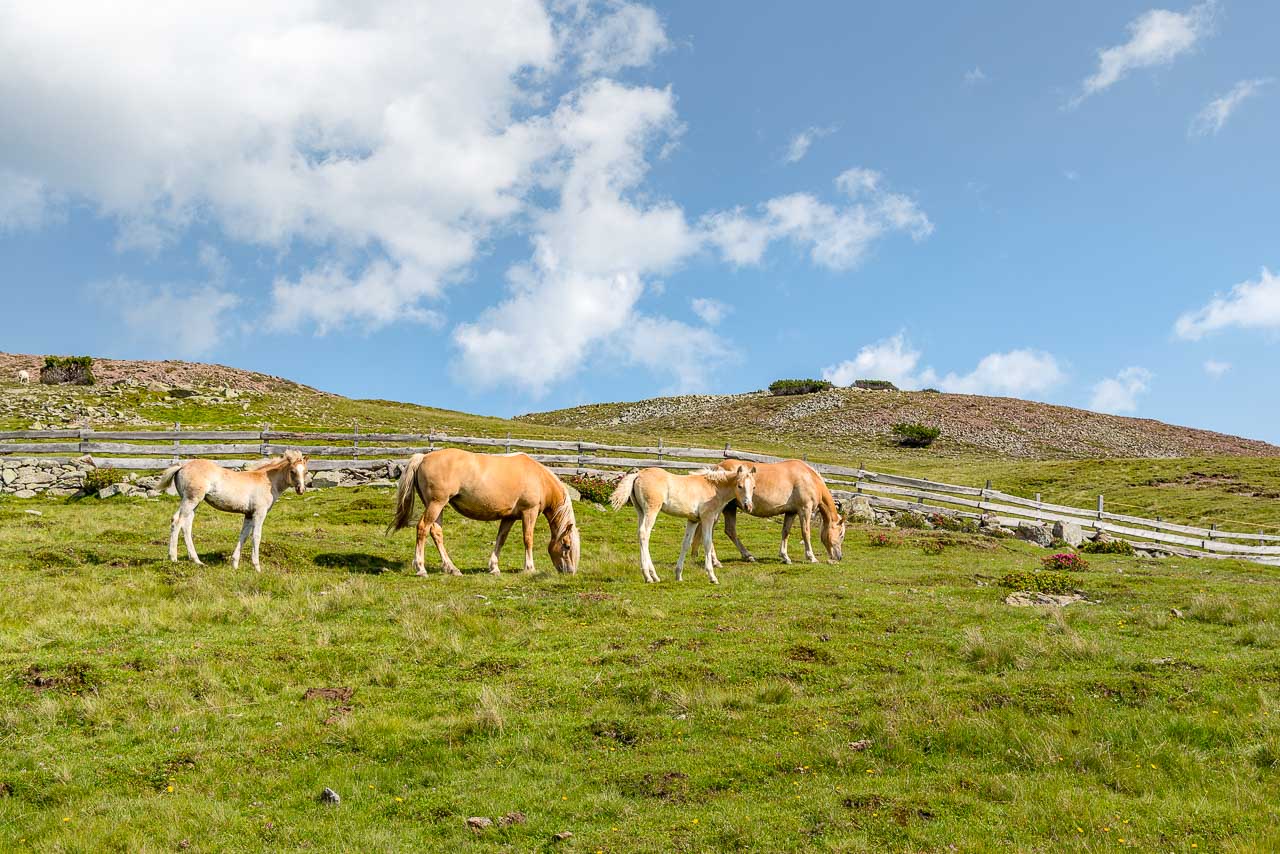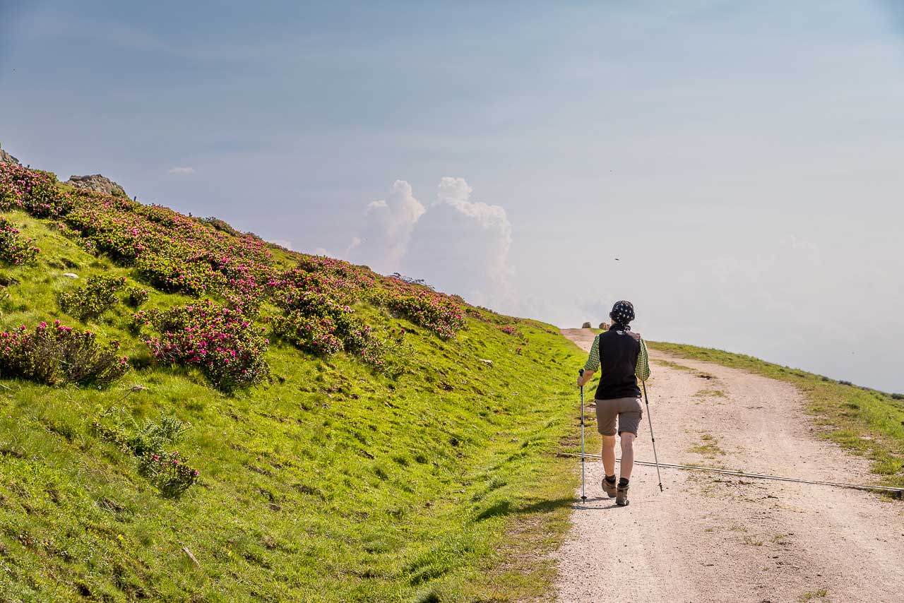Entlang des Naturlehrpfades Klangweg geht es recht gemütlich bis Gasthof Unterhorn und dann, vorbei an der Feltuner Hütte, bis zu Oberhornalm hinauf. Der Almweg führt uns links um das Rittner Horn herum. Die linke Flanke des Rittner Horns überrascht mit Alpenrosen. Ich bin begeistert, denn bis heute habe ich das Rittner Horn immer nur von der in meinen Augen nicht so schönen Südseite, also der Skibergseite gesehen. Hier an der Westseite entpuppt sich das Rittner Horn plötzlich als richtig traditionelle Alm. Sehr schön!