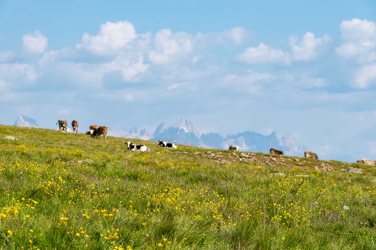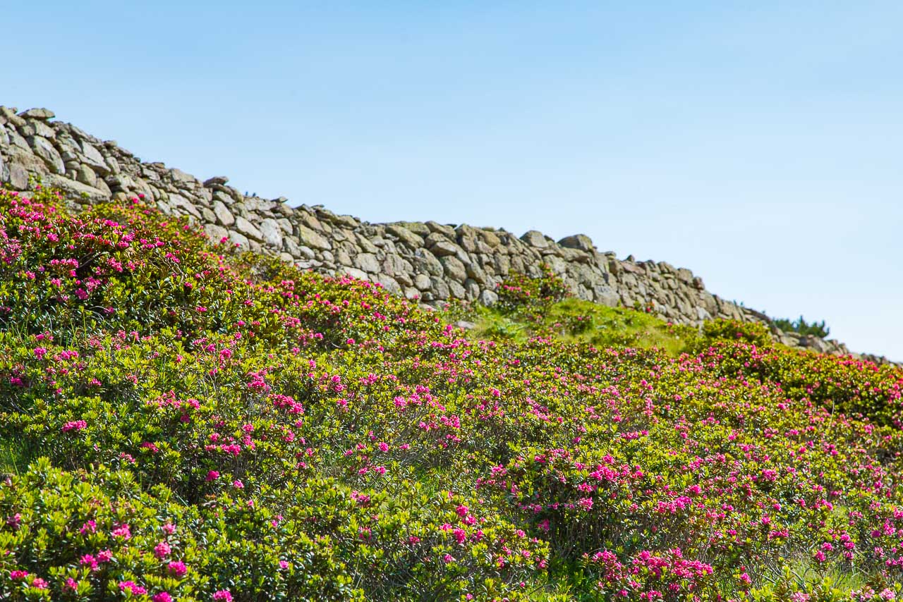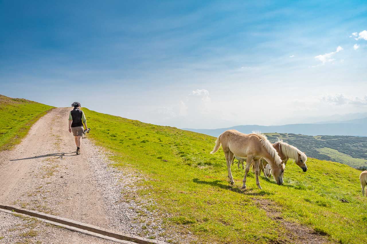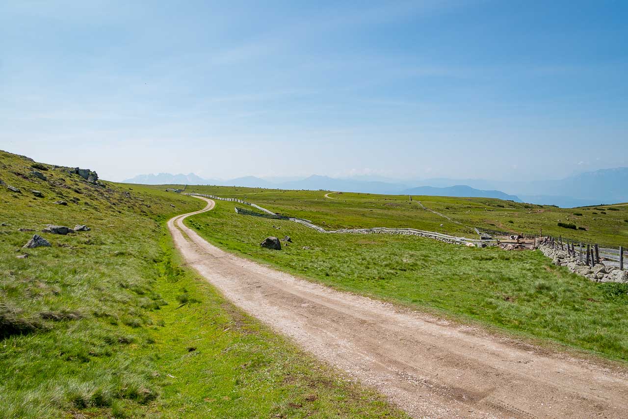 Entlang des Naturlehrpfades Klangweg geht es recht gemütlich bis Gasthof Unterhorn und dann, vorbei an der Feltuner Hütte, bis zu Oberhornalm hinauf. Der Almweg führt uns links um das Rittner Horn herum. Die linke Flanke des Rittner Horns überrascht mit Alpenrosen. Ich bin begeistert, denn bis heute habe ich das Rittner Horn immer nur von der in meinen Augen nicht so schönen Südseite, also der Skibergseite gesehen. Hier an der Westseite entpuppt sich das Rittner Horn plötzlich als richtig traditionelle Alm. Sehr schön!