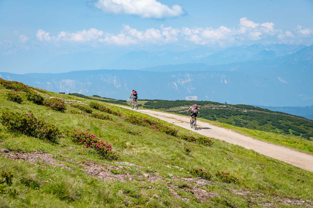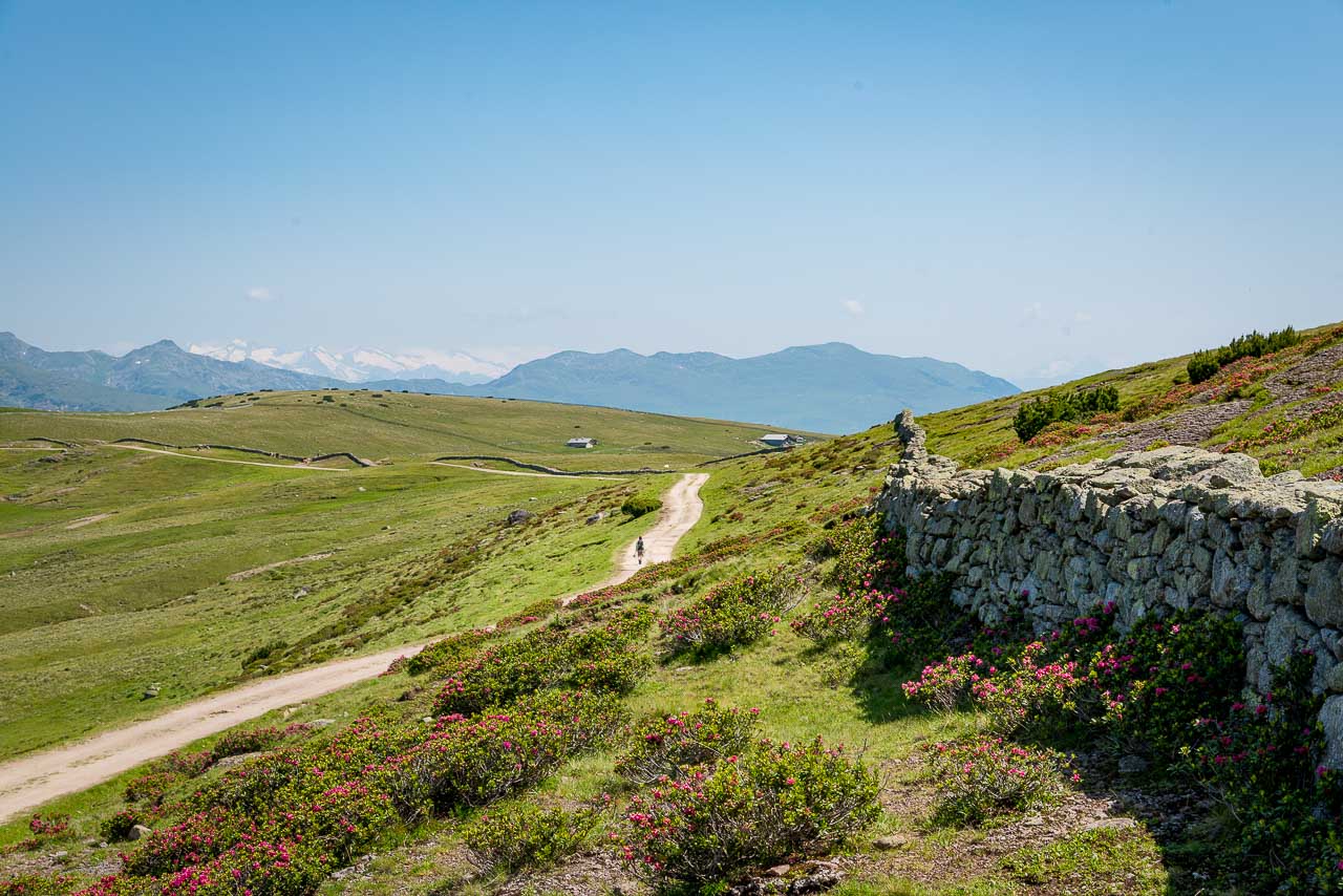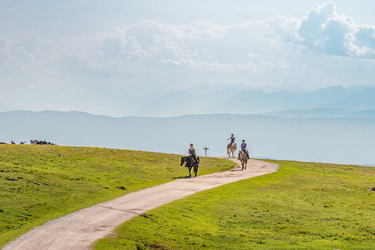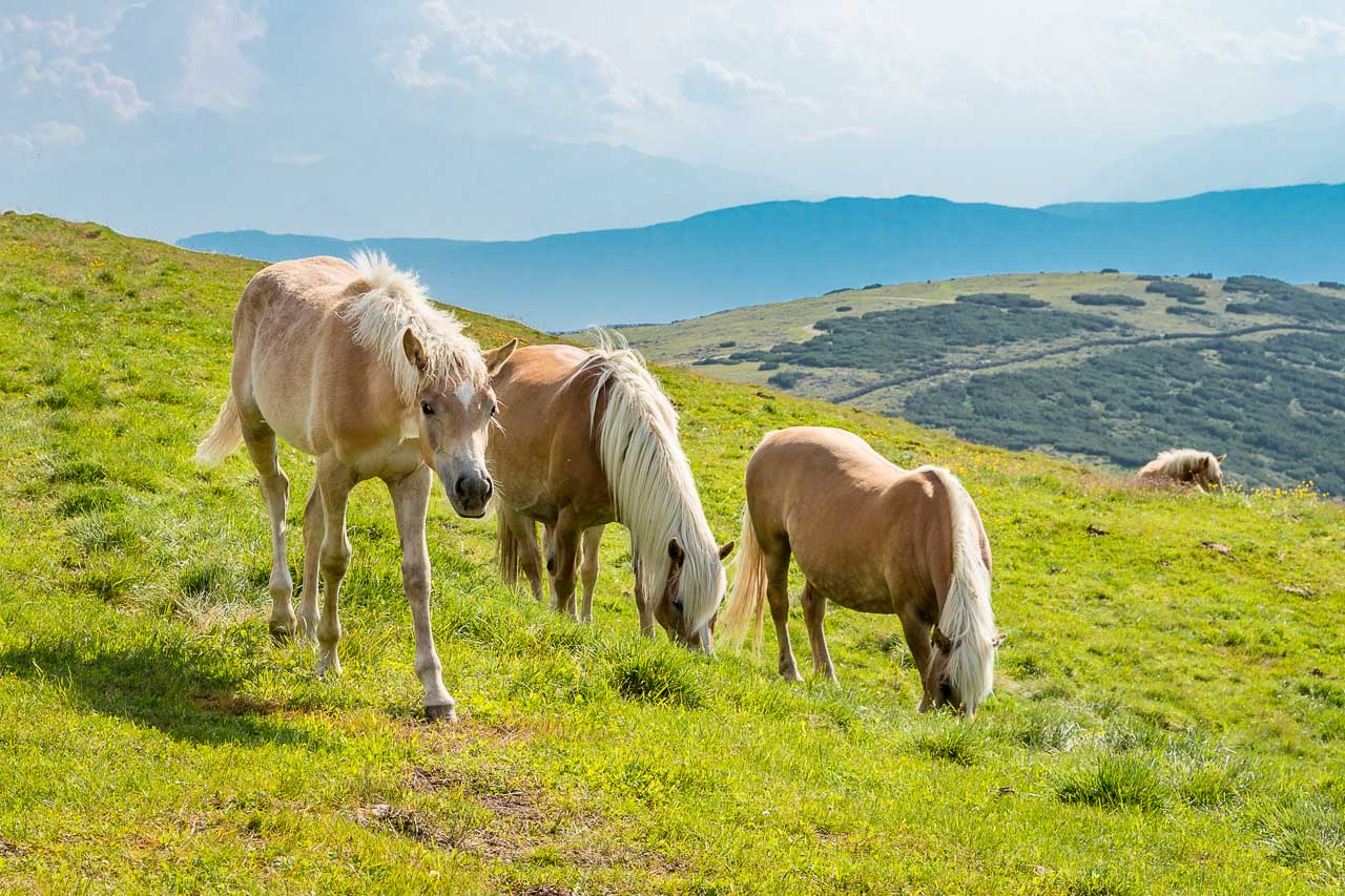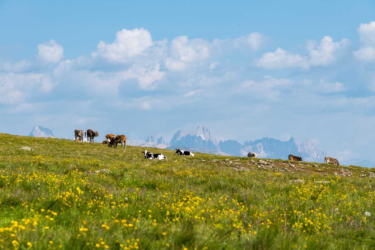 Entlang des Naturlehrpfades Klangweg geht es recht gemütlich bis Gasthof Unterhorn und dann, vorbei an der Feltuner Hütte, bis zu Oberhornalm hinauf. Der Almweg führt uns links um das Rittner Horn herum. Die linke Flanke des Rittner Horns überrascht mit Alpenrosen. Ich bin begeistert, denn bis heute habe ich das Rittner Horn immer nur von der in meinen Augen nicht so schönen Südseite, also der Skibergseite gesehen. Hier an der Westseite entpuppt sich das Rittner Horn plötzlich als richtig traditionelle Alm. Sehr schön!