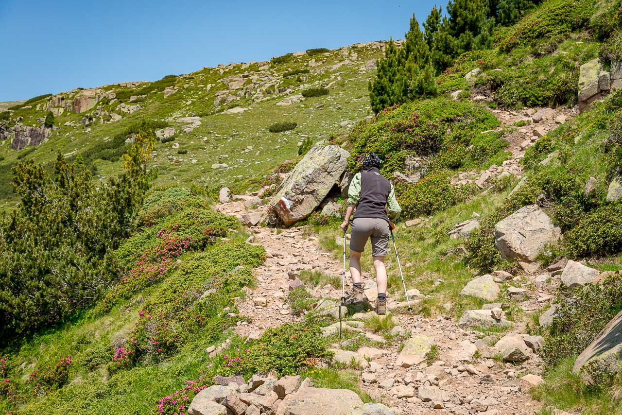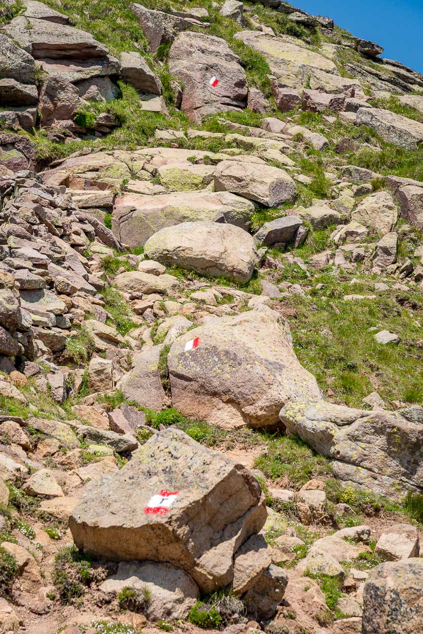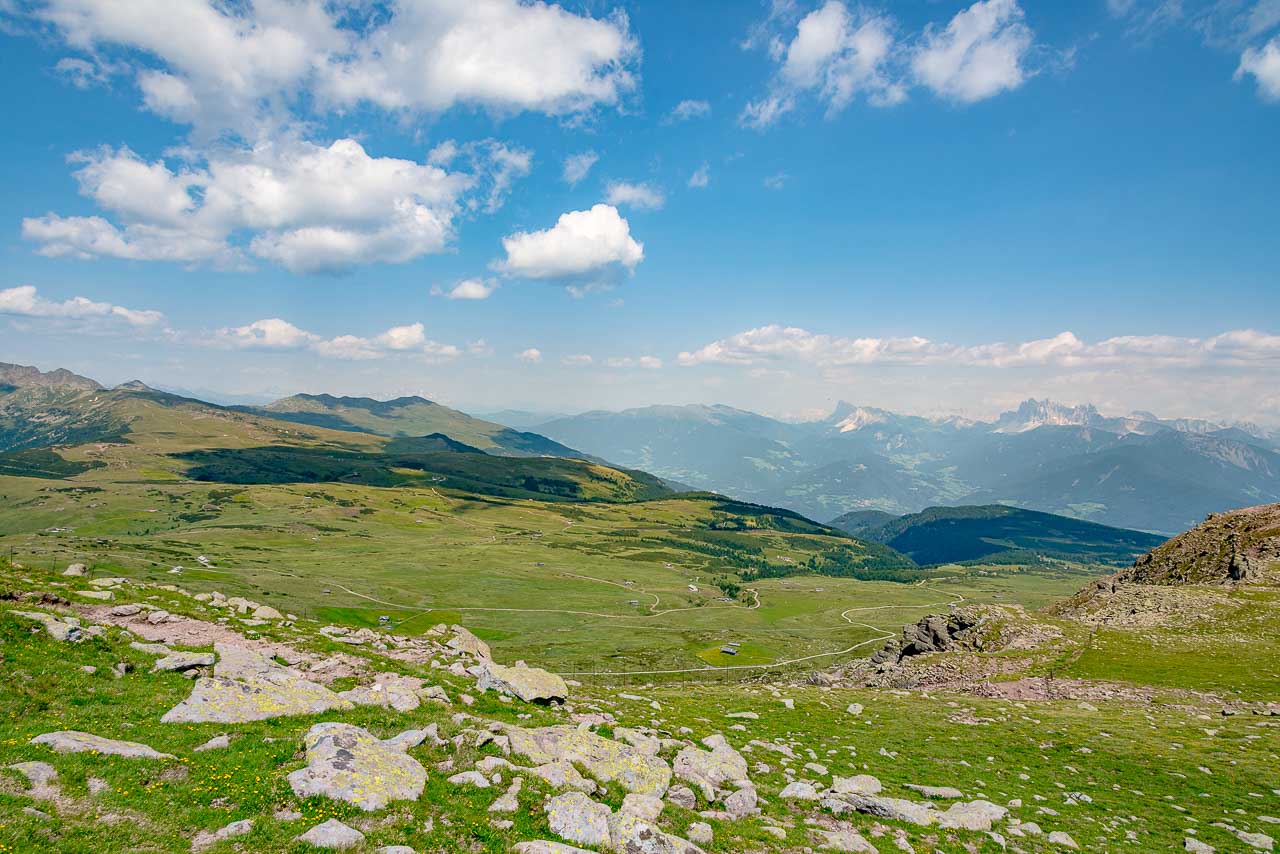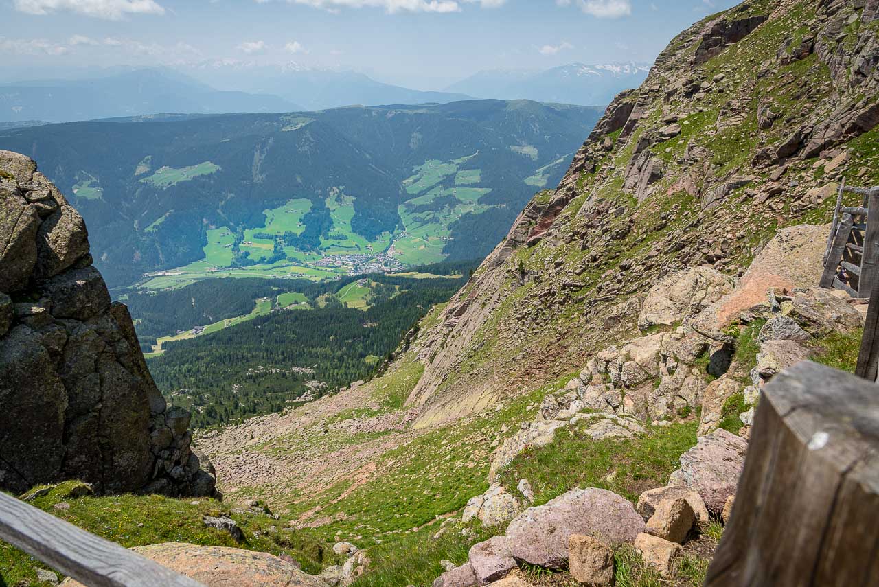 Wir biegen links ab und folgen der Markierung Nr. 3 durch Almwiesen hindurch. Wir sind nun alleine unterwegs, die meisten Wanderer sind am Gasteiger Sattel gerade aus Richtung Villanderer Alm oder Villanderer Berg gewandert. So genießen wir die ruhige Zweisamkeit und erfreuen uns am stetig schöner werdenden Wandersteig. Vereinzelte Alpenrosen säumen den Weg, ein Hochmoor muss gequert werden, verstreute Felsbrocken machen den Steig abwechslungsreich. Allmählich werden die Felsbrocken mehr und mehr, sodass wir vom Wandern zum Blockfelsen Gehen übergehen müssen.