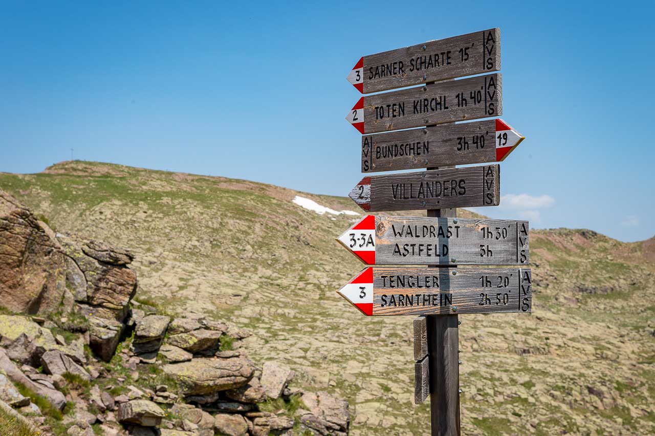 Fast hätten wir die Abzweigung zur Sarner Scharte verpasst, wahrscheinlich weil es das einzige vernachlässigte, stark verwitterte, Schild auf dem 3 bis 4 Schilder tragenden Wegweiser ist.