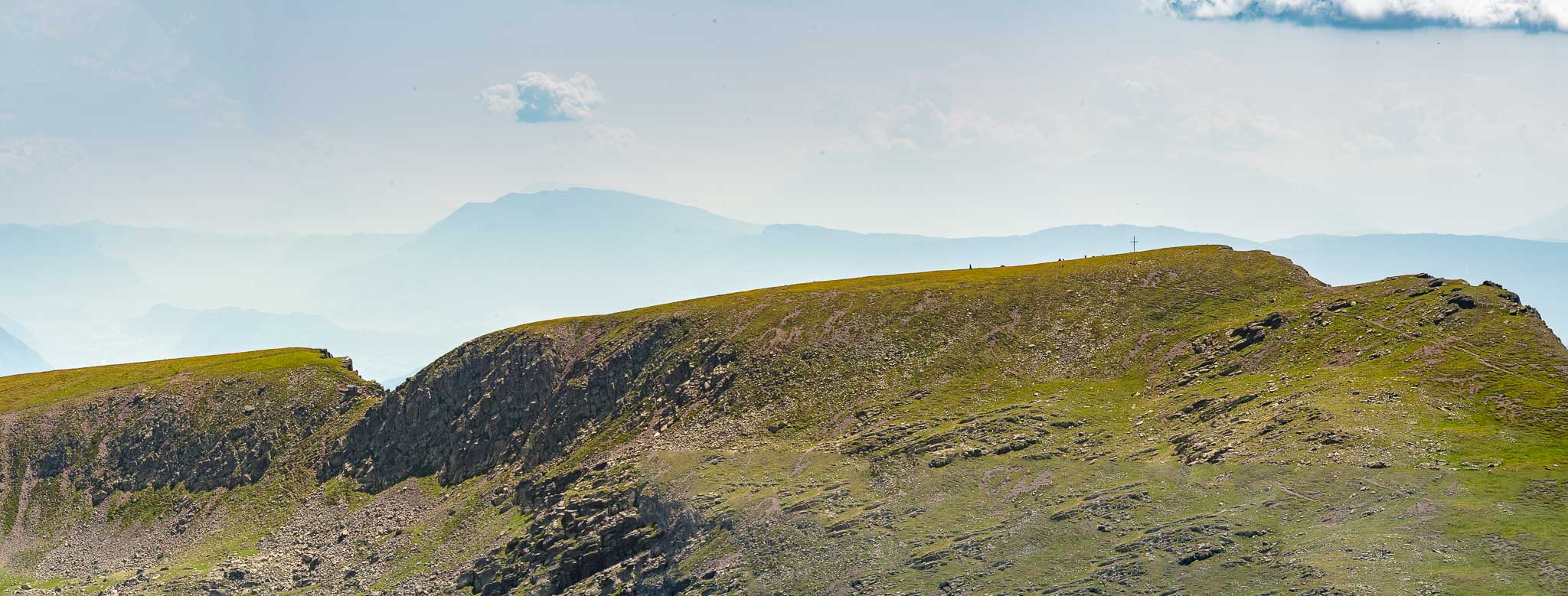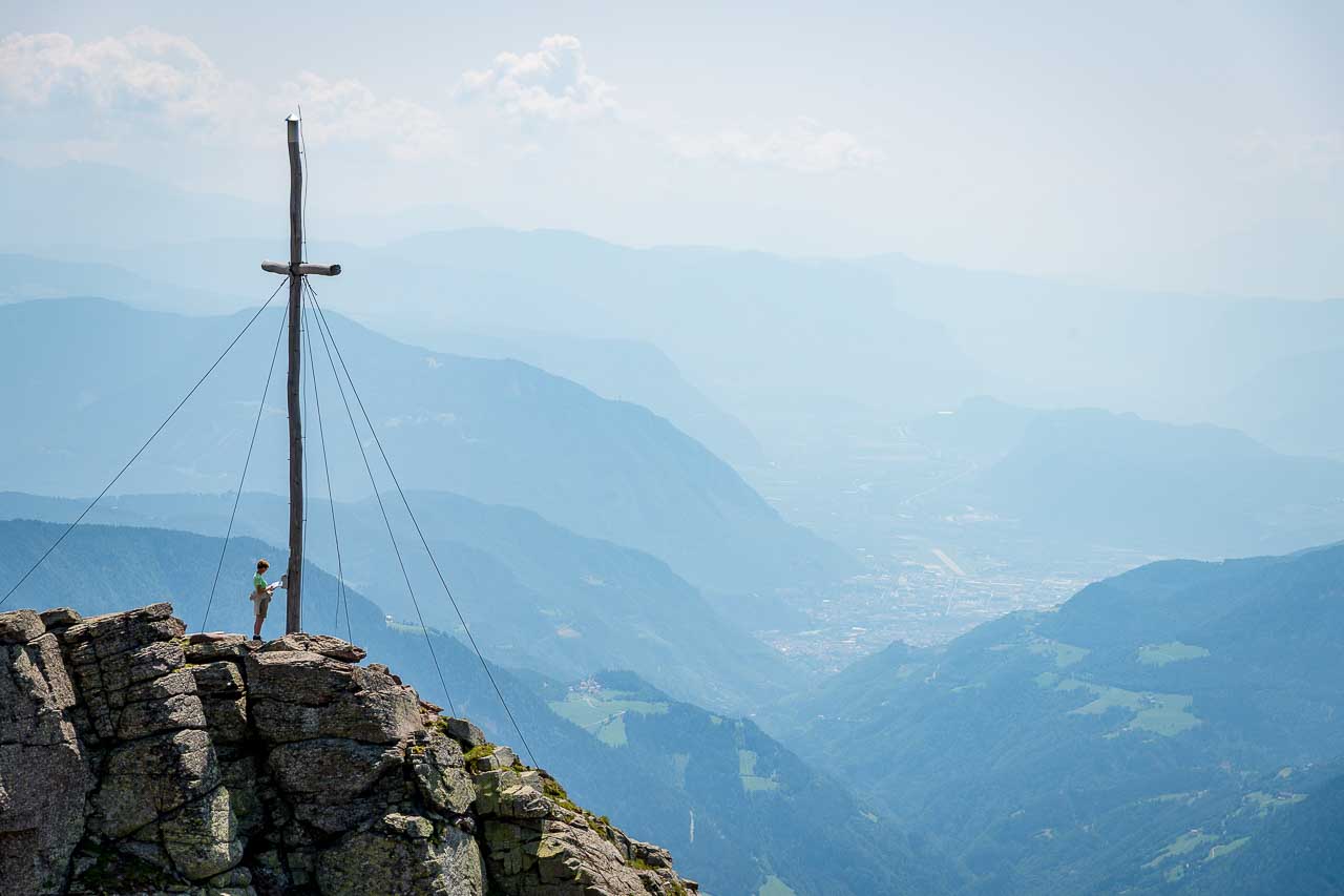 Fotopause, Tiefblick ins Sarntal entlang des Steigs Nr. 3 genießen, Panoramablick in Richtung Dolomiten einfangen, Biwak anschauen und dann bin ich soweit die letzten Höhenmeter bis zum Gipfelkreuz zu bestreiten. Diese erweisen sich als überschätzt, so erreicht nicht nur die beste Ehefrau von allen, sondern auch der Unterfertigte, relativ frisch, die in unserem Küchenfenster, oft bestaunte Sarner Scharte.