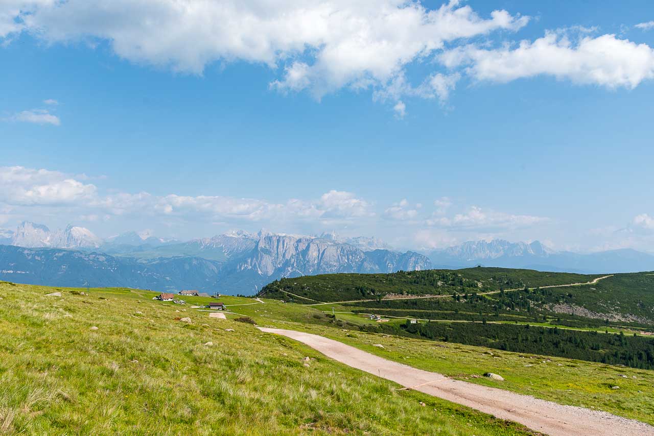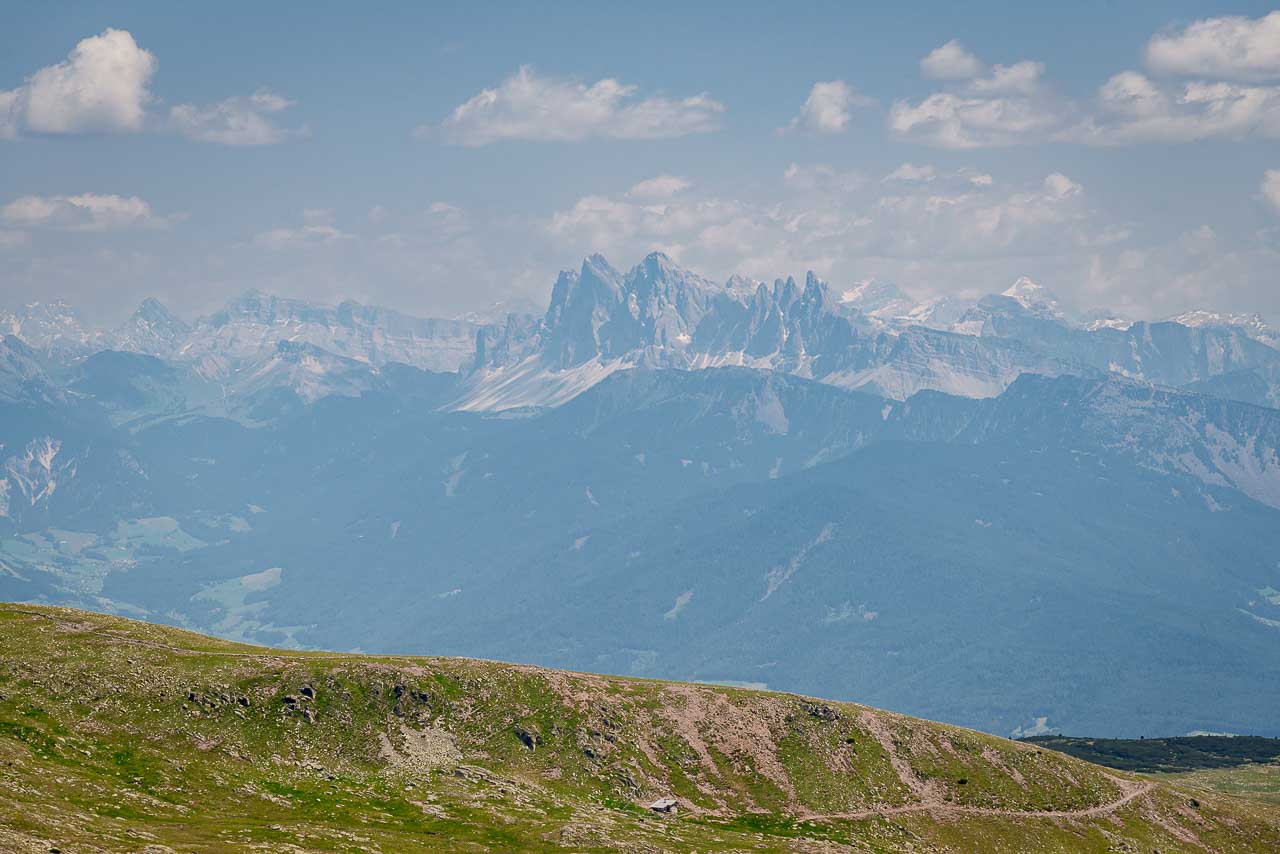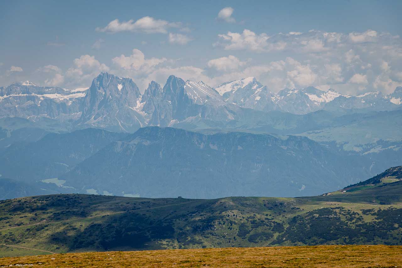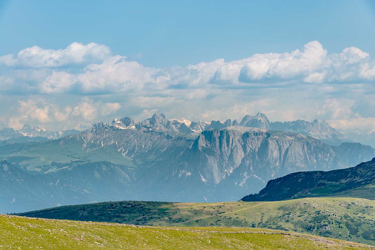Wir beide gehen nun auch diesen Weg, den der Fernwanderer auch als E10 kennt. Zügig wandern wir bis zum Gasteiger Sattel zurück und dann leicht ansteigend um das Rittner Horn bis zum Unterhorn hinüber. Der Blick auf den Schlern und den Rosengarten ist nun bedeutend eindrucksvoller als in der Früh. Die Abendsonne lässt fast jede Felsritze erkennen. Am Morgen waren die bleichen Dolomitenwände noch im Schatten versunken.