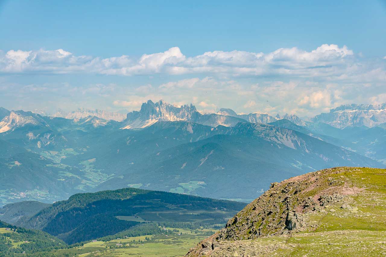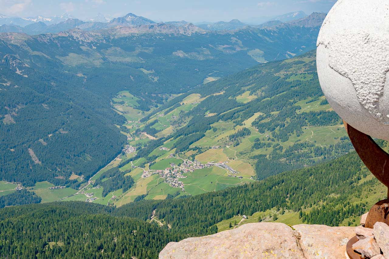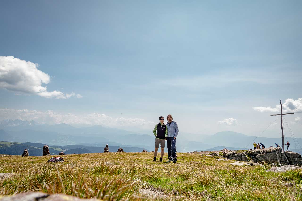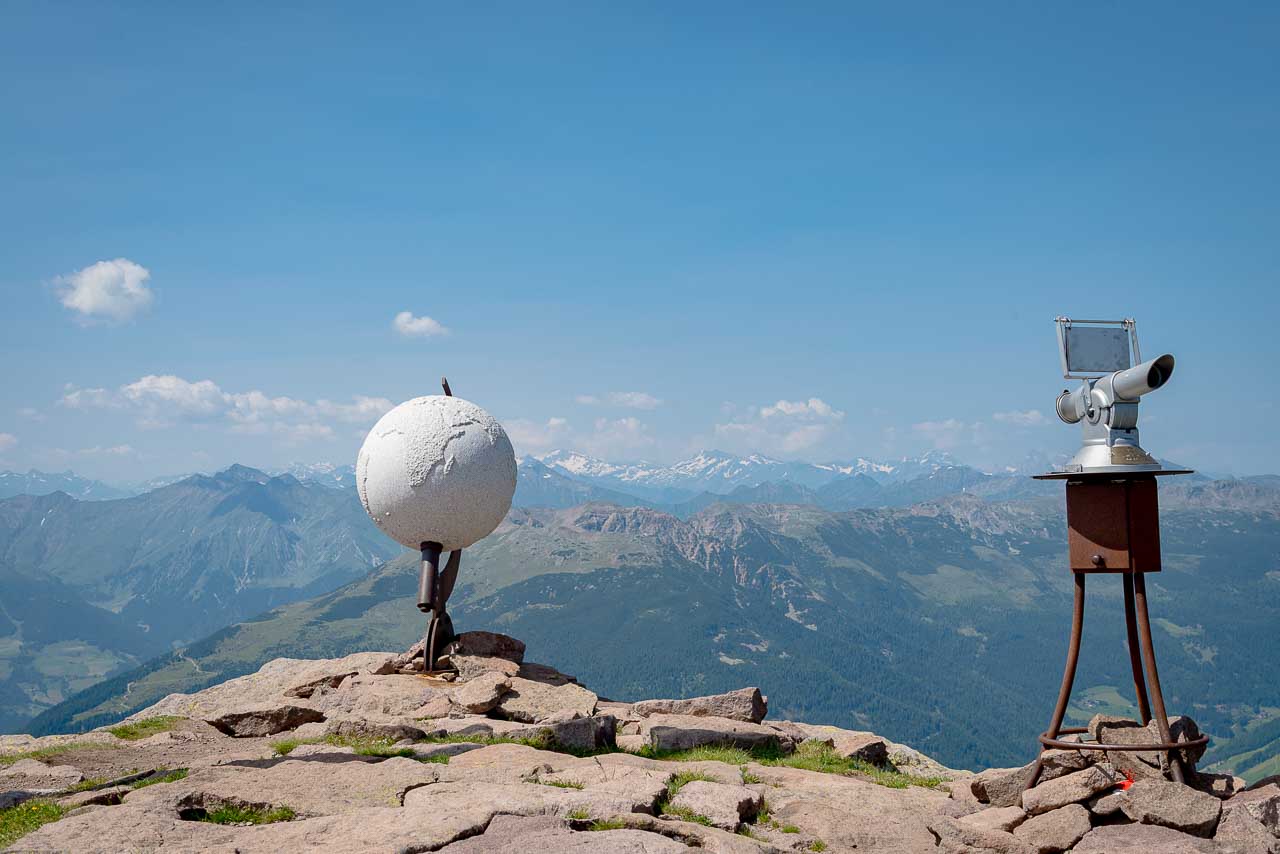 Wir bleiben nicht lange und brechen auf um im weiten Bogen zum Villanderer Berg hinüber zu wandern. Einige wenige Höhenmeter hinunter, dann wieder hinauf und schon stehen wir auf dem um 50 Meter höheren Berg und werden überrascht. Neben dem Gipfelkreuz steht eine riesige steinerne Weltkugel und ein Fernrohr, welches mit einer Gradeinteilung und einer Legende versehen ist. So kann man nach entsprechender Einstellung die wichtigen Gipfel rund um den Villanderer Berg von ganz nah erkunden. Der Ortler im Südwesten, die Wildspitze im Westen, die Dolomiten im Osten alles dabei.