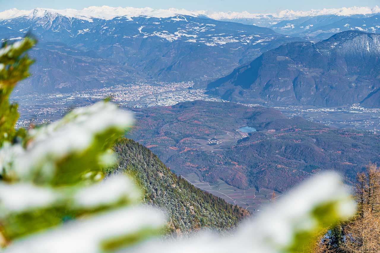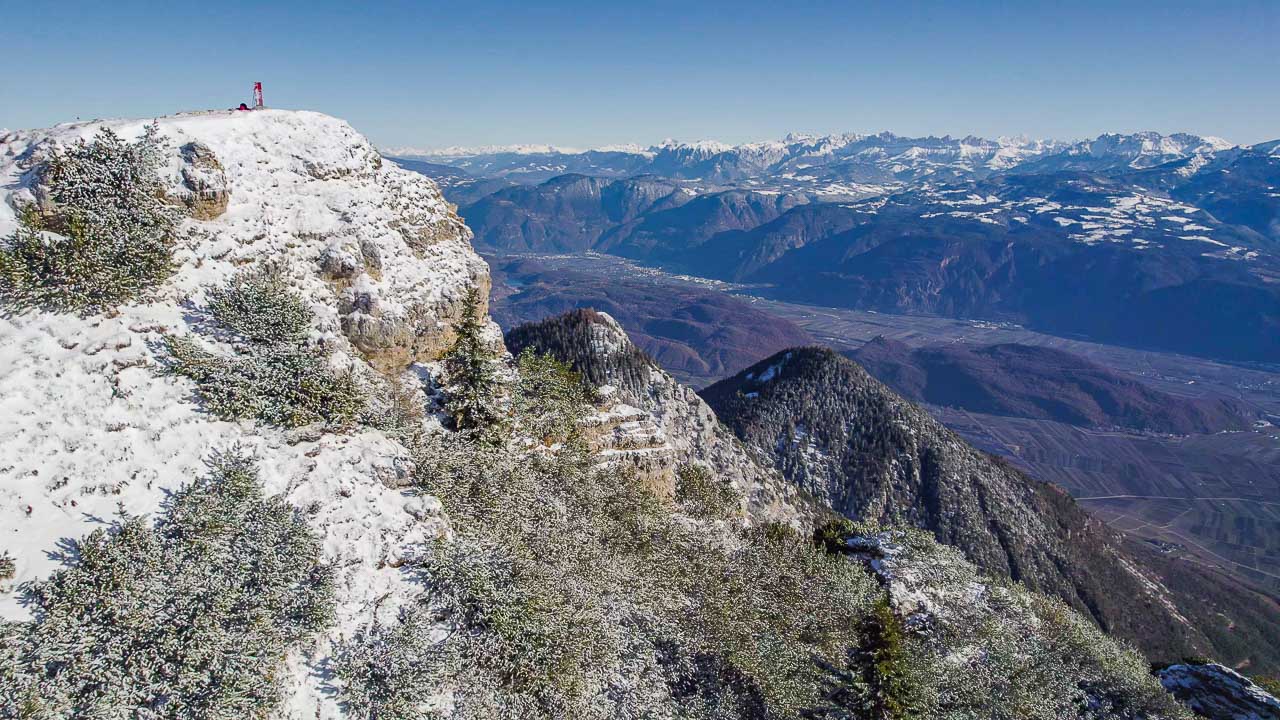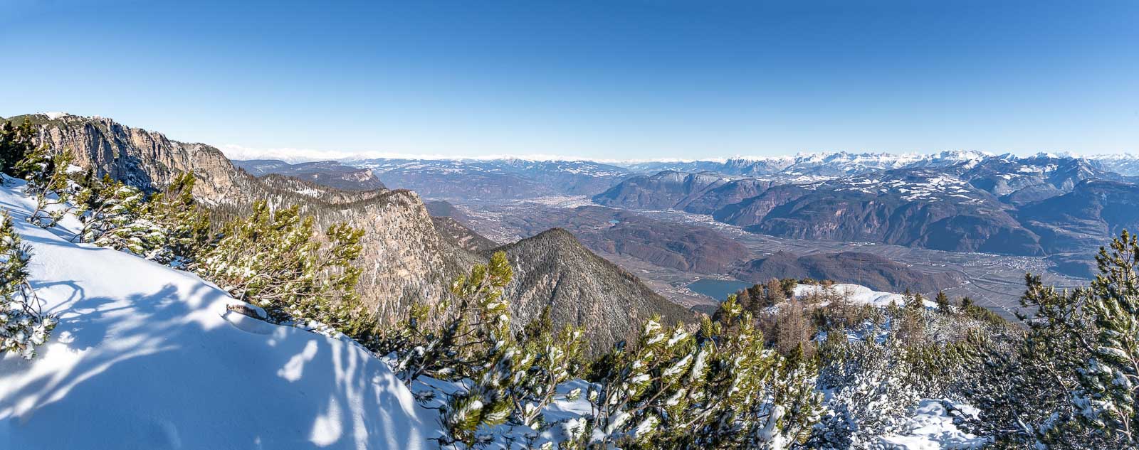 Einziger Wermutstropfen des Monte Roens, von seinem Gipfel ist der Kalterer See nicht sichtbar. Der tiefer gelegene, bewaldete Paterkopf mit dem vorgelagerten Göllerberg verdecken die Sicht.