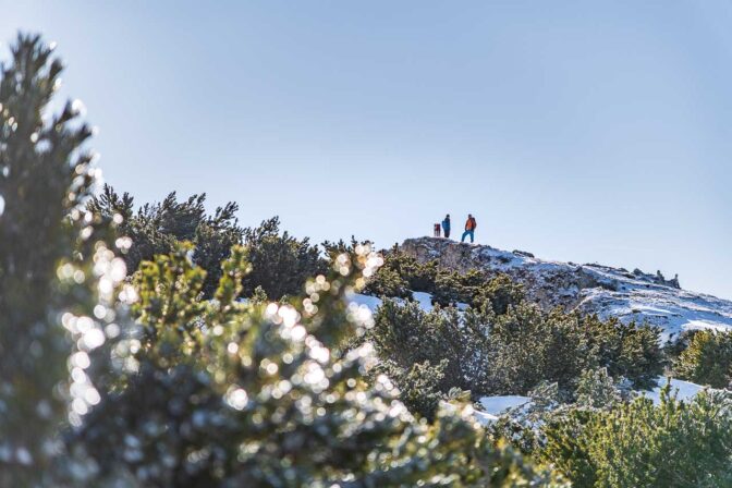 Winterwanderer auf dem Gipfel des Traminer Hausberges, dem Roen