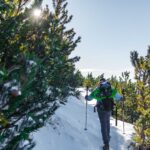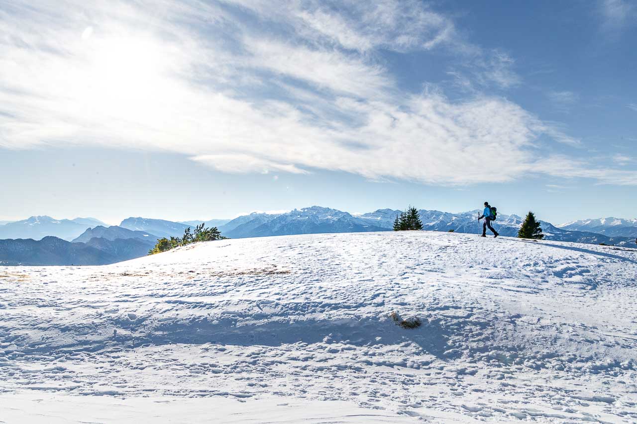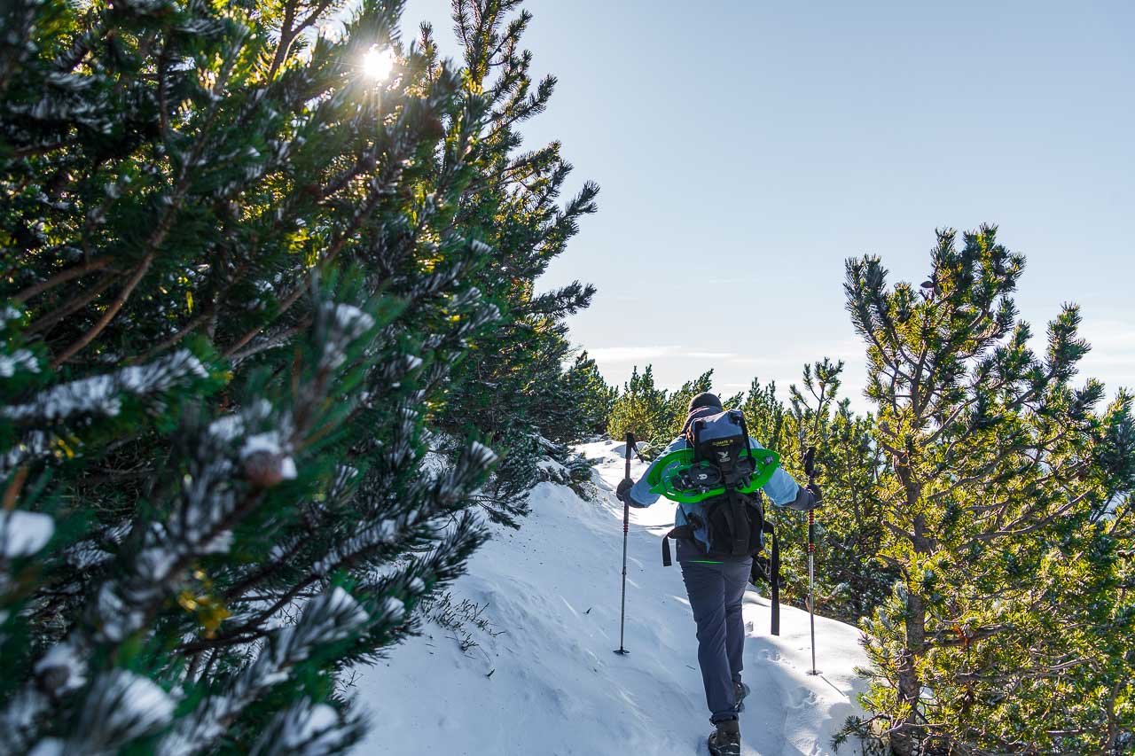 Unter dem Gipfel des Roens dürfen wir nun seine wilde Ostflanke bewundern. Die Wanderung durch die grün-weißen Latschenfelder entpuppt sich bald als Höhepunkt dieser Schneewanderung.