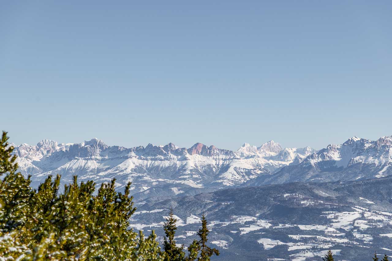 Von hier oben scheint das Mendelgebirge wie eine sanfte Almwiese aus. Der herrliche Ausblick auf die Brenta-Dolomiten, die Adamello-Presanella-, die Ortler-Alpen Richtung Westen sowie die Südtiroler Dolomiten in Richtung Osten rahmen die Berglandschaft fantastisch ein.