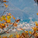 Ich hatte den Aufstieg etwas kürzer in Erinnerung. Aber zum Glück kommen wir gleichzeitig mit Annas erster Anfrage „Wenn sein mir do?“ beim ersten Aussichtspunkt an. Durch goldbraunfarbene Eichenblätter hindurch, schauen wir hinunter auf die Etsch auf Neumarkt und auf Auer.