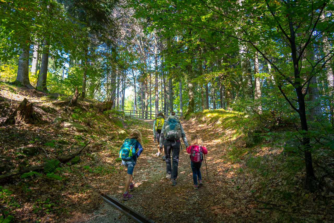 Lustigerweise führt uns der weitere Wegverlauf – im wahrsten Sinne des Wortes – direkt mitten durch das Berggasthof Dorfer hindurch. Die Zeit reicht für einen schnellen Kaffee und eine kurze Plauderei mit dem Wirt. Der Uwe und ich hätten gerne hier gegessen, aber die Frauen sahen sich wegen des Chaos, dass die Kleinen veranstalten würden nicht darüber hinaus.